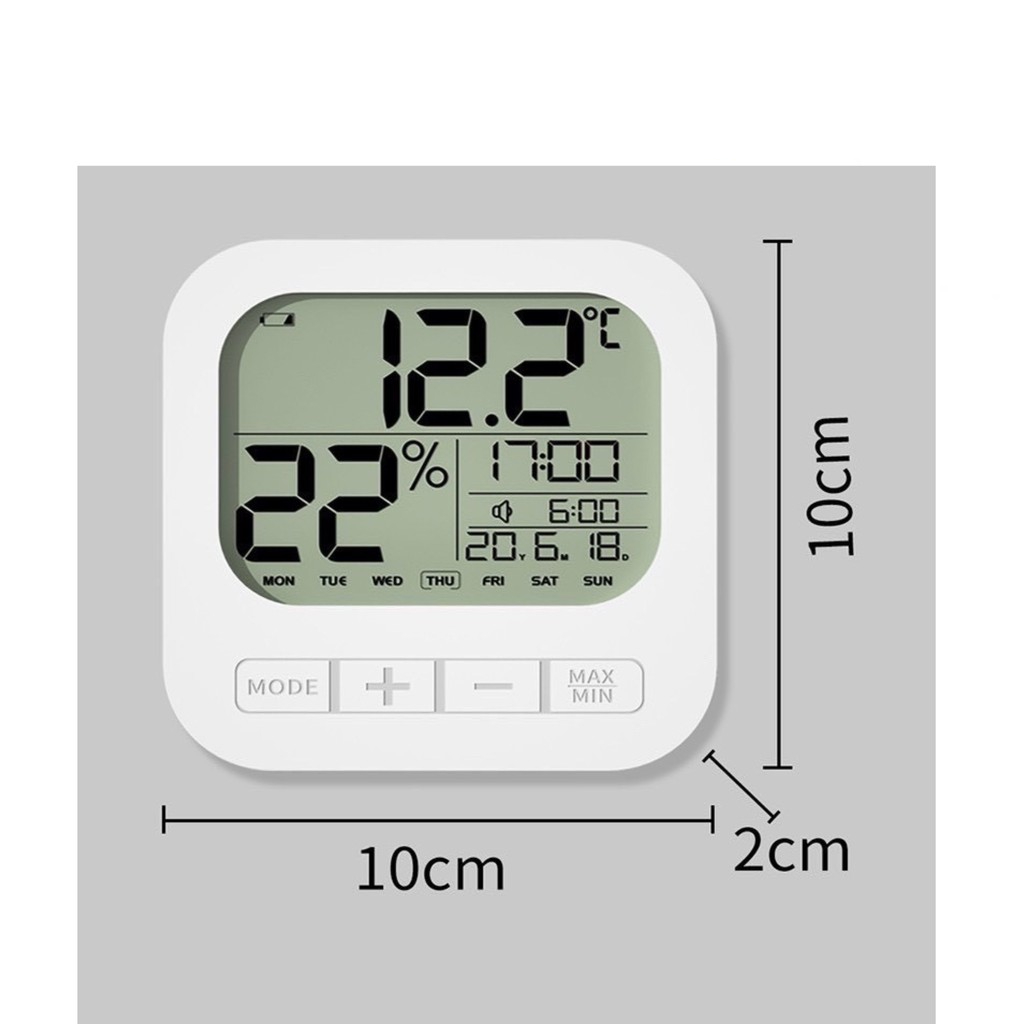 Mua tại TiktokHOM-HCM2201-TOOL10007-01 Nhiệt kế, Nhiệt kế điện tử, Nhiệt kế phòng, Nhiệt ẩm kế, đo nhiệt độ và độ ẩm trong phòng Thông tin chung: Nhiệt độ và độ ẩm là 2 yếu tố ảnh hưởng rất lớn để giấc ngủ của bé. Nhiệt độ trên điều hòa sẽ không phản ánh được chính xác nhiệt độ trong phòng vì còn phụ thuộc vào nhiều yếu tố: nhiêt độ bên ngoài, diện tích phòng, vị trí bé nằm. Vì vậy cần có nhiệt kế để biết chính xác nhiệt độ trong phòng của bé. Nhiệt độ lý tưởng cho bé ngủ ngon là 16 - 24 độ, độ ẩm là 40 - 60%. Chức năng: Đo nhiệt độ Đo độ ẩm Đồng hồ Xem ngày , tháng, năm Chức năng hẹn giờ Thông số máy: Mắc sắc: Trắng Kích thước: 10 x 10 x 2 cm. Chất liệu: Nhựa ABS. Phạm vi nhiệt độ: -10 độ C đến 50 độ C. Độ chính xác nhiệt độ: +- 1 độ C. Phạm vị độ ẩm: 20% đến 99%. Độ ẩm chính xác: +- 5 độ C. Sử dụng pin AAA (2 viên). Đóng gói: hộp carton (máy được bọc bởi lớp chống xóc an toàn + giấy hướng dẫn sử dụng). Hướng dẫn sử dụng: [MODE]: ấn và giữ 2 giây để cài đặt thời gian. [+]: chuyển đổi hệ thống giờ 12h hay 24h và sử dụng để tăng thời gian. [-]: chuyển đổi Độ C hoặc Độ F và sử dụng để giảm thời gian. [Max/Min]: Hiển thị độ ẩm và nhiệt độ tối đa/thấp nhất trong ngày. [Alarm]: ấn và giữ 2 giây để cài đặt hẹn giờ. [Alarm Off]: tắt chế độ hẹn giờ.