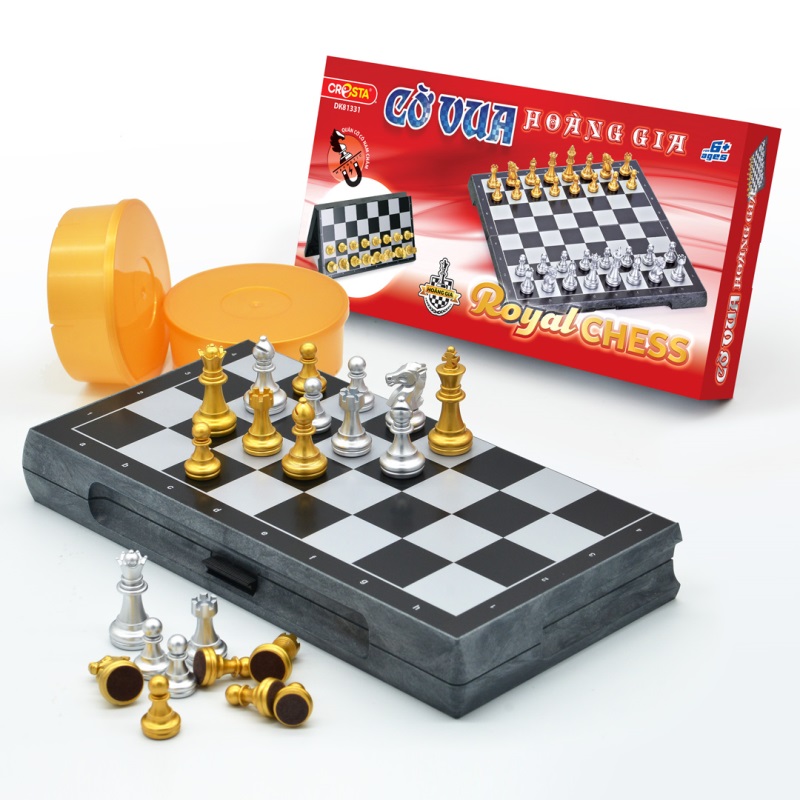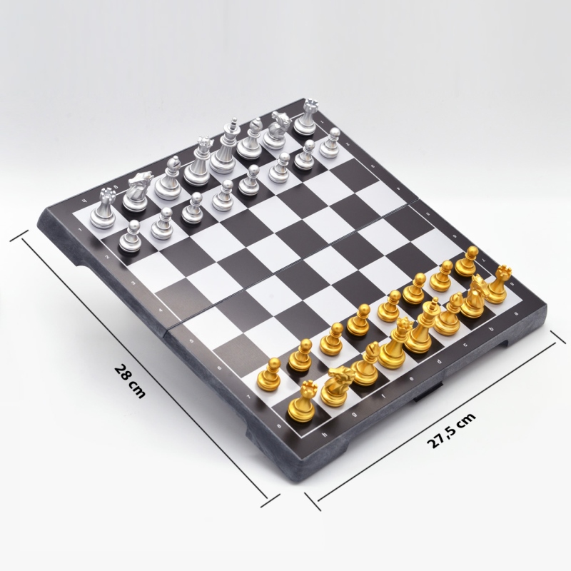 Với chất liệu nhựa ABS an toàn, bàn cờ được thiết kế trơn nhẵn, không góc cạnh, quân cờ được phủ lớp nhũ vàng, bạc bắt mắt, các quân cờ và bàn cờ được tráng một lớp từ tính (nam châm), để giúp khi chơi không bị đổ.