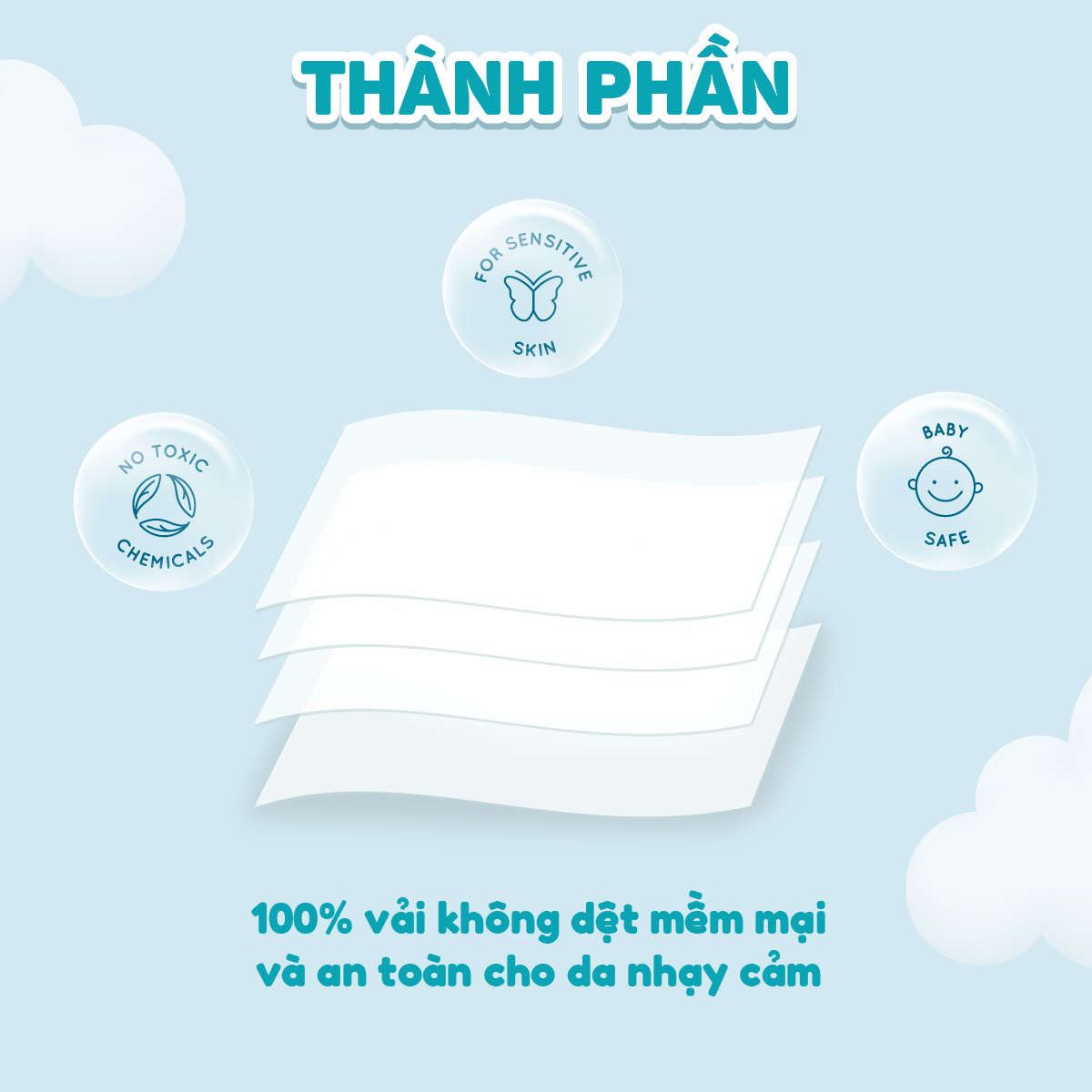 Được làm từ sợi vải không dệt, rất dai, mềm, mịn và có độ đàn hồi cao. Dạng khô, thích hợp cho làn da nhạy cảm nhất. An toàn cho bé, tiết kiệm cho mẹ.