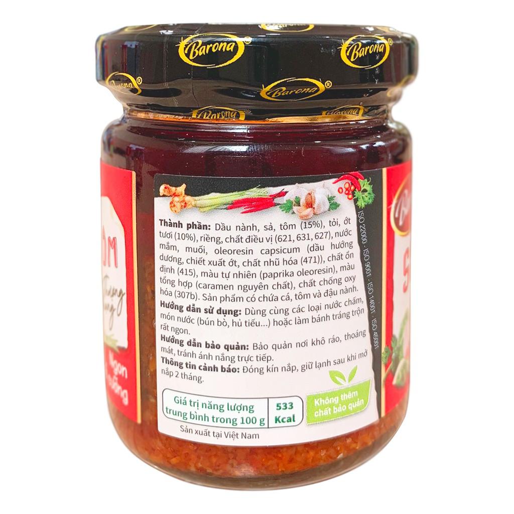 - Cho bún, thịt, chả vào tô, thêm nước dùng và các loại rau ăn kèm và thưởng thức. Mách nhỏ: Ăn kèm Sa tế Tôm XO Thượng hạng càng ngon hơn QUY CÁCH: 80g/gói x 20 gói/hộp x 4 hộp/thùng THỜI HẠN SỬ DỤNG: 12 tháng kể từ ngày sản xuất Sa tế tôm XO thượng hạng Barona làm từ ớt tươi được chọn lọc kỹ lưỡng hoà quyện cùng vị tôm chấy & sả tươi phi thơm tạo nên hương vị thơm ngon khó cưỡng, thổi bùng vị giác muốn ăn mãi không ngừng. Sản phẩm không thêm chất bảo quản & được bảo quản trong hũ thuỷ tinh cao cấp, đảm bảo an toàn cho cả gia đình.