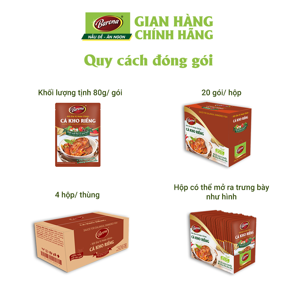 *Mẹo nhỏ: Xốt Gia Vị Hoàn Chỉnh Barona Cá Kho Riềng sẽ ngon hơn khi kho trong nồi đất (tộ) và dùng nguyên liệu cá trắm/ cá mè, có thể thêm ít nghệ tươi.