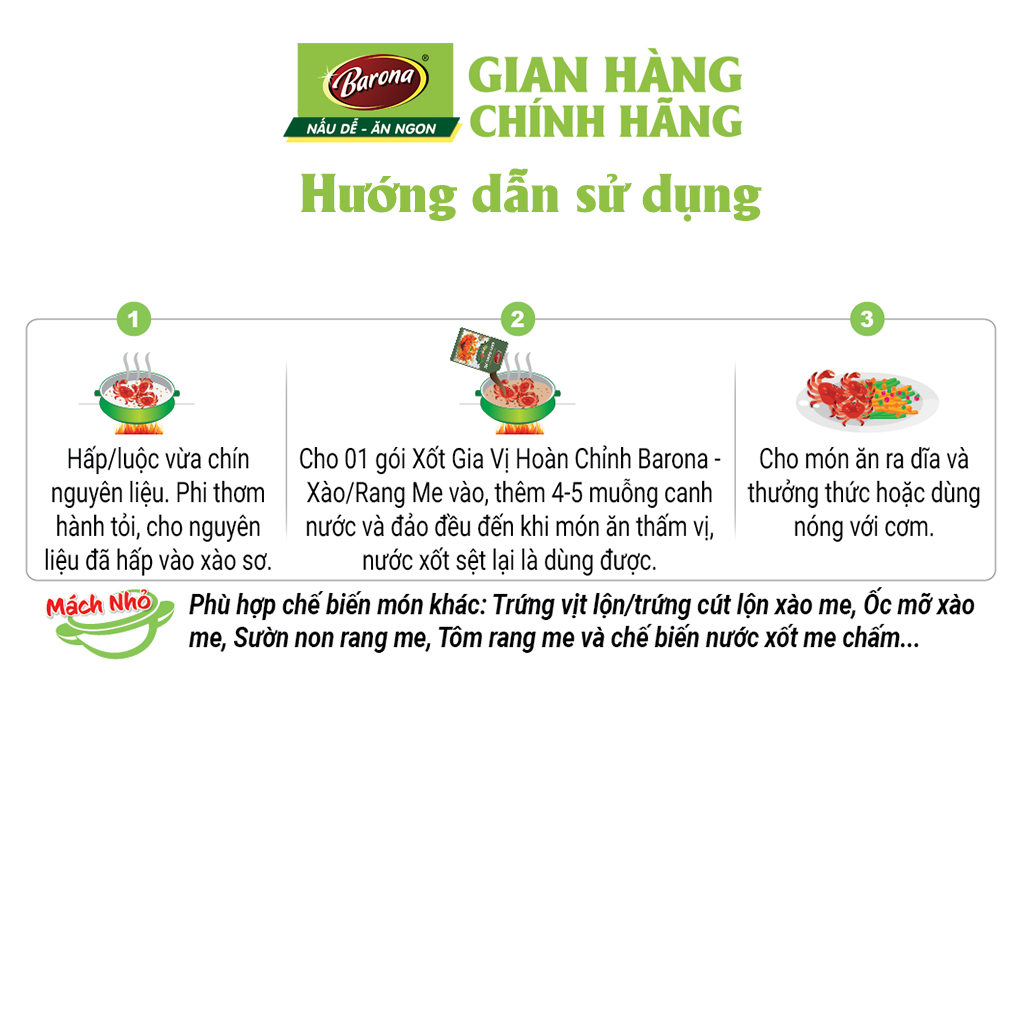 Gia Vị Xào/ Rang Me Barona 80g ướp ngon chuẩn vị không cần nêm nếm Xốt Gia Vị Hoàn Chỉnh Barona Xào/ Rang Me 80g là công thức phối trộn độc đáo giữa CHIẾT XUẤT