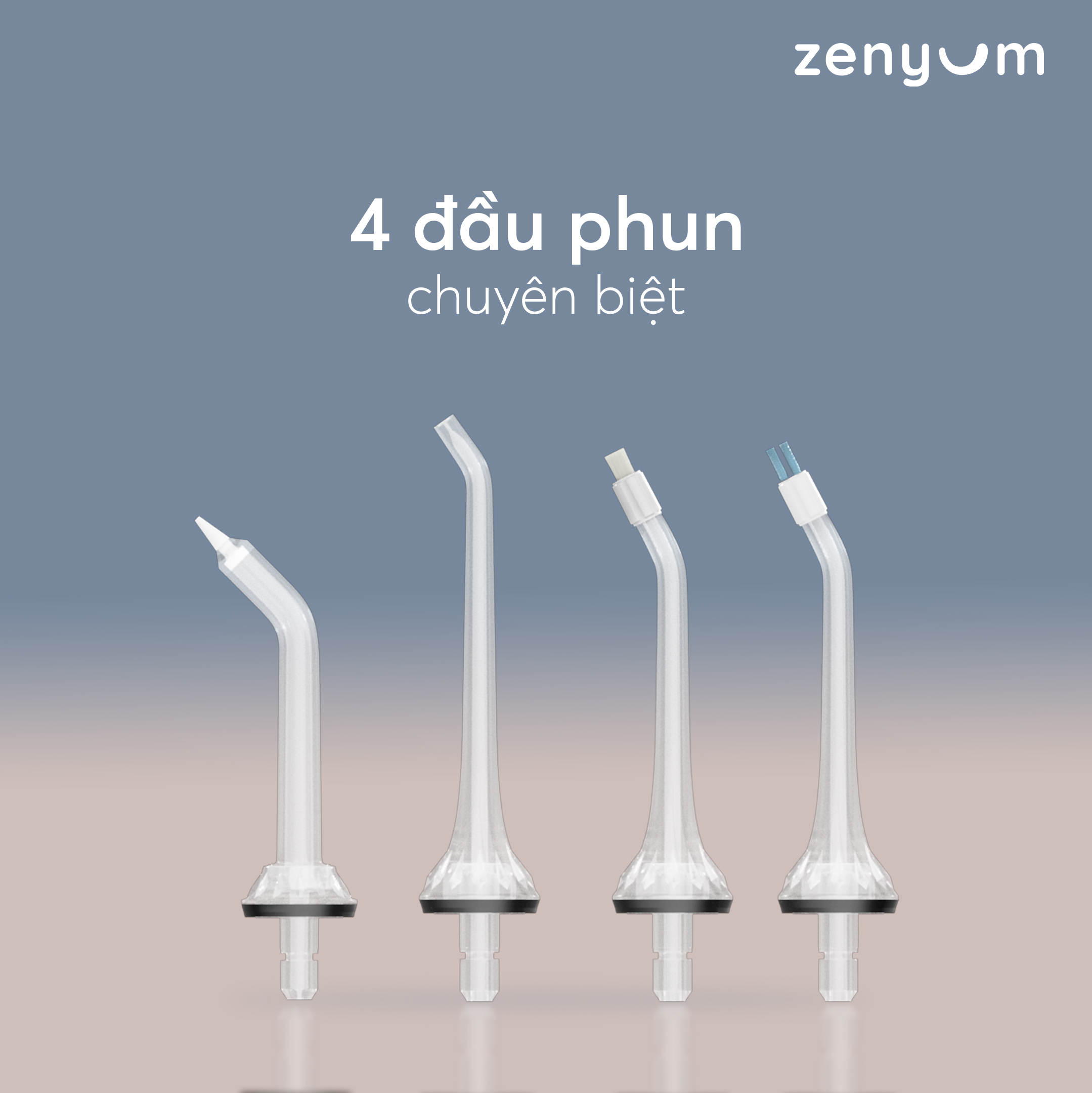 Máy tăm nước Zenyum Pro (Trắng/ Đen)   Sử dụng công nghệ xung động nước tần số cao, tăm nước Zenyum Pro giúp làm sạch thức ăn, mảng bám trong kẽ răng, túi nha chu, là những vị trí mà bàn chải không chạm đến được.    BỘ SẢN PHẨM GỒM: > 1 Thân máy tăm nước Zenyum Pro > 4 đầu phun chuyên dụng > 1 phiếu hướng dẫn sử dụng > 1 cáp sạc USB   TÍNH NĂNG:  > Công nghệ xung động nước tần số cao (1400 - 1800 lần/phút). Giúp làm sạch hiệu quả thức ăn, mảng bám trong từng kẽ răng > Khả năng tuỳ chỉnh áp lực làm sạch theo nhu cầu cá nhân > Màn hình OLED cùng 5 chế độ làm sạch, đáp ứng mọi nhu cầu của bạn. Đặc biệt chế độ DIY cho phép tuỳ chỉnh áp lực nước theo nhu cầu của riêng bạn, rất phù hợp cho các bạn có tình trạng răng miệng nhạy cảm.  > Đa năng và linh hoạt với 4 đầu phun chuyên biệt có thể điều chỉnh xoay 360 độ giúp tia nước có thể chạm đến mọi ngóc ngách trong khoang miệng. > Thời lượng pin đến 30 ngày cho 1 lần sạc. > Chống nước IPX7 > Dung tích bình nước đến 280ml, hạn chế phải thêm nước trong quá trình sử dụng. > Bảo hành chính hãng 1 năm.      CÁCH SỬ DỤNG:  > Lắp vòi phun mong muốn của bạn vào thân máy cho đến khi nghe tiếng tạch. > Mở nắp bình chứa và đổ đầy nước. Lưu ý chỉ đổ nước khi máy đang được tắt. Nhấn nút Nguồn để mở máy. > Nhấn nút điều chỉnh chế độ để chọn chế độ mong muốn. Nhấn nhiều lần để đổi qua các mức độ Nhẹ - Trung Bình - Mạnh và chế độ DIY tuỳ chỉnh. > Điều chỉnh hướng của tia nước bằng cách xoay đầu phun. > Giữ máy thẳng đứng để đảm bảo dòng nước chảy dễ dàng từ bình chứa  ** MÁCH BẠN: Để làm sạch tốt nhất, hãy bắt đầu với mặt trong của răng sau đó đến mặt ngoài răng. Di chuyển đầu phun theo đường chân nướu và dừng lại một chút ở từng kẽ răng. Tiếp tục cho đến khi làm sạch cả mặt trong, mặt ngoài, hàm trên và hàm dưới.      CHĂM SÓC KHÁCH HÀNG: Nếu gặp bất cứ vấn đề gì cần hỗ trợ hãy inbox cho gian hàng của Shop ngay nhé!