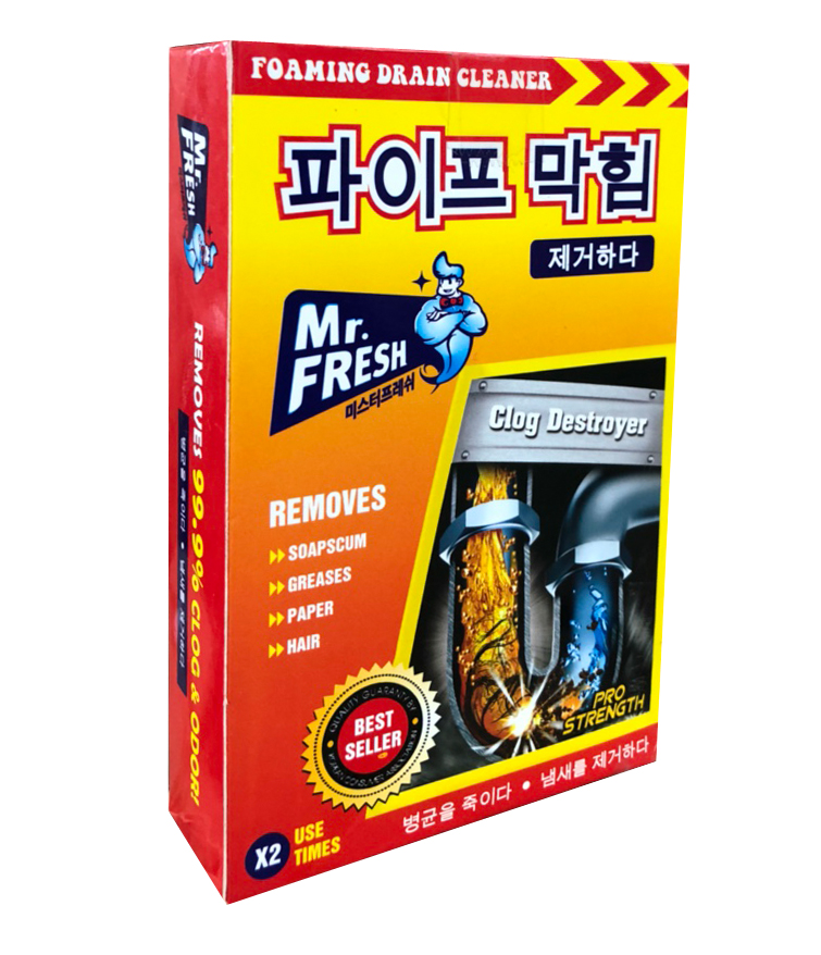 Bột thông tắc đường ống thoát nước Mr.Fresh Hàn Quốc là một trong những sản phẩm tốt nhất được bán chạy ở Hàn Quốc với công thức tiên tiến, các thành phần hóa học chuyên dụng, độ tẩy cực mạnh sẽ xoáy tan mọi cặn bẩn trong đường ống một cách hiệu quả.Sản phẩm sẽ thông sạch mọi loại cặn bẩn như giấy, rác, rau, mỡ, thịt, gạo, tóc… kẹt trong đường ống thoát nước của chậu rửa nhà bếp, lavabo, bồn tắm… mà không làm hư hại đường ống và các thiết bị vệ sinh.Bột thông tắc đường ống thoát nước Mr.Fresh Hàn Quốc trong thành phần của nó luôn có các hỗn hợp hóa học có độ kiềm, độ ăn mòn, độ phân hủy cực cao, giúp phân hủy các hợp chất hữu cơ, chất cặn bã có trong đường ống gây tắc nghẽn.