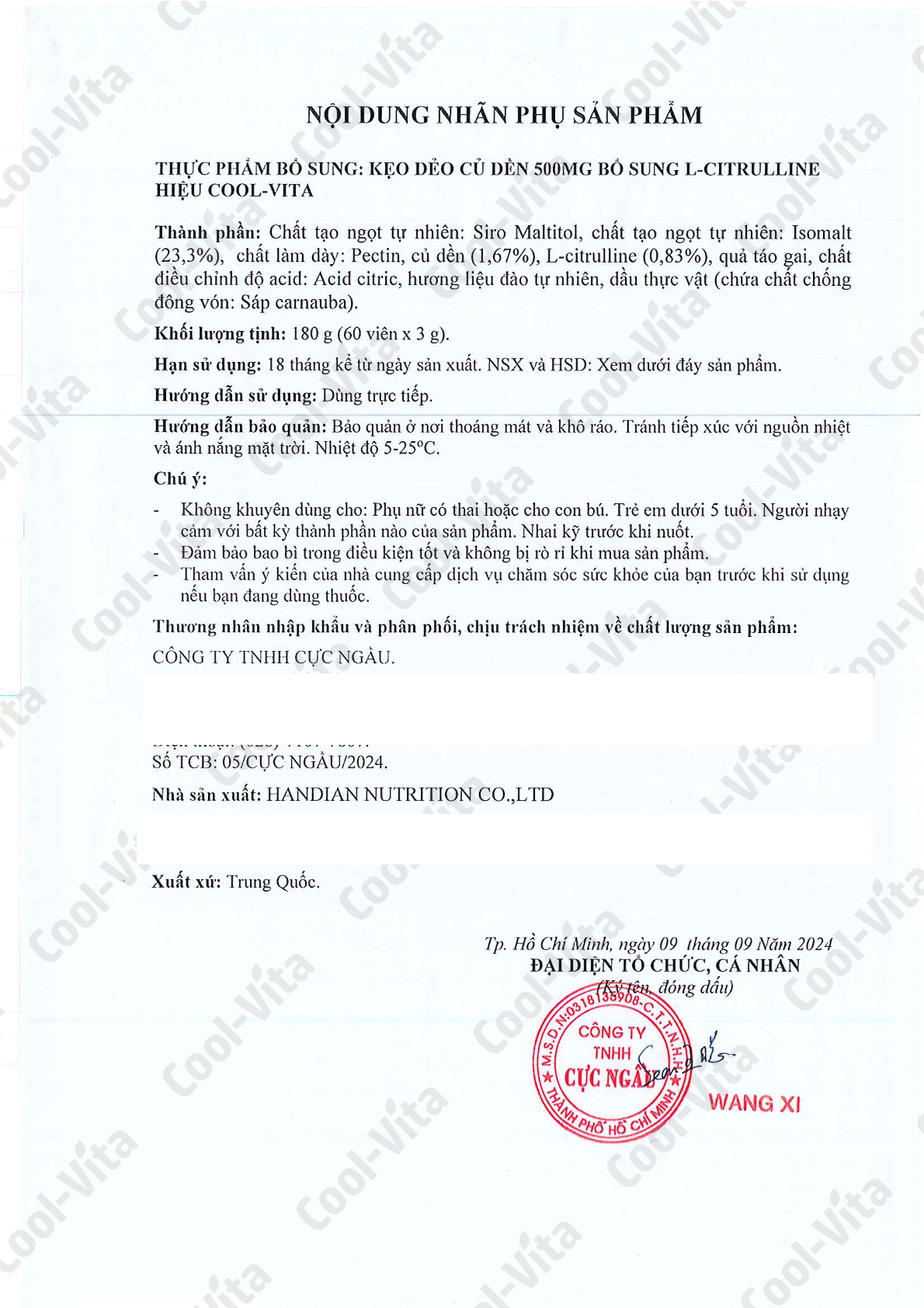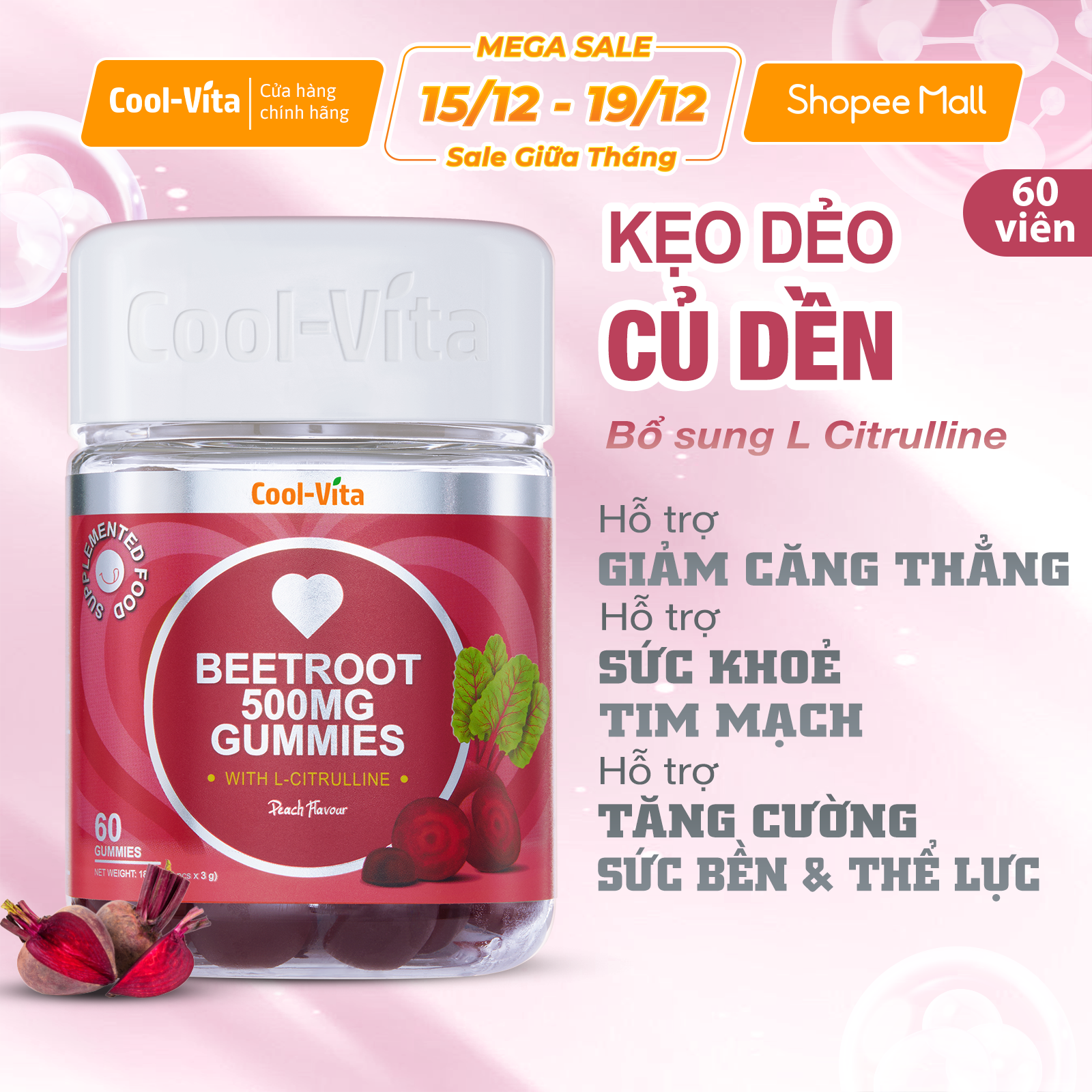 Mua tại TiktokCombo 2 Hộp Kẹo Dẻo Củ Dền Hỗ Trợ Sức Khỏe Tim Mạch & Hỗ Trợ Tăng Cường Sức Bền Vị Đào Kết Hợp L-Citrulline Coolvita (60 viên x 3g)/hộp Kẹo dẻo củ dền CoolVita với 500mg chiết xuất củ dền trong mỗi 2 viên kẹo, kết hợp cùng L-Citrulline là sự lựa chọn hoàn hảo hỗ trợ bạn duy trì sức bền dẻo dai, hỗ trợ cải thiện sức khỏe tim mạch và hỗ trợ tăng cường khả năng vận động. Với thành phần chính là chiết xuất củ dền và L-Citrulline, Kẹo Dẻo Củ Dền CoolVita hỗ trợ bạn đạt được thể trạng tốt hơn, hỗ trợ tăng cường khả năng chịu đựng và hỗ trợ phục hồi nhanh chóng sau khi tập luyện. Kẹo Dẻo Củ Dền CoolVita có vị ngọt tự nhiên, thơm vị đào, sẽ là một sản phẩm không thể bỏ qua nếu như bạn là người yêu thích một chế độ dinh dưỡng lành mạnh và có hương vị thơm ngon. Đặc biệt hiệu quả cho phụ nữ: Hỗ trợ hấp thụ sắt • Betaine trong củ dền hỗ trợ tăng hiệu quả hấp thụ sắt, cải thiện tình trạng thiếu máu. Bảo vệ tế bào máu khỏi lão hóa • Betalains (sắc tố đỏ tự nhiên trong củ dền) có đặc tính hỗ trợ chống oxy hóa mạnh, bảo vệ tế bào máu và làm chậm quá trình lão hóa tế bào. Cải thiện sức khỏe tổng thể: • Hỗ trợ giúp da dẻ hồng hào hơn, nhờ bổ sung sắt và tăng cường tuần hoàn máu, cải thiện tình trạng da nhợt nhạt do thiếu máu. • Hỗ trợ kinh nguyệt đều đặn hơn, giúp điều hòa hormone trong cơ thể, cải thiện các vấn đề kinh nguyệt do thiếu máu hoặc tuần hoàn máu không tốt. • Hỗ trợ giấc ngủ tốt hơn, Magie và nitrat trong củ dền giúp thư giãn cơ bắp, giảm huyết áp, cải thiện chất lượng giấc ngủ. • Củ dền thúc đẩy lưu thông máu, đặc biệt hữu ích cho phụ nữ hay bị lạnh tay chân. Những lợi ích nổi bật khác: Hỗ trợ tăng cường sức bền và thể lực: L-Citrulline hỗ trợ trì hoãn mệt mỏi cơ bắp, hỗ trợ tăng cường khả năng chịu đựng và phục hồi sau tập luyện. Hỗ trợ sức khỏe tim mạch: Hỗ trợ bổ sung betaine (choline betaine) và chiết xuất quả táo gai hỗ trợ cải thiện lưu thông máu, hỗ trợ sức khỏe tim mạch và hỗ trợ tăng cường chức năng tiêu hóa. Hỗ trợ tiêu hóa: Củ dền chứa nhiều chất xơ và betaine hydrochlorid, hỗ trợ cho sự co bóp của ruột và hỗ trợ giữ cho hệ tiêu hóa luôn khỏe mạnh. Giải pháp dinh dưỡng tiện lợi: Kẹo dẻo dễ sử dụng, hỗ trợ bổ sung dưỡng chất cần thiết mỗi ngày mà không cần phải pha chế phức tạp. Vì sao nên chọn Kẹo Dẻo Củ Dền COOL-VITA? Hỗ trợ dễ dàng bổ sung dinh dưỡng: Kẹo Dẻo Củ Dền CoolVita hỗ trợ bổ sung các dưỡng chất thiết yếu mỗi ngày mà không cần phải lo lắng về khẩu vị hay việc chuẩn bị phức tạp. Vị ngọt tự nhiên: Với vị đào ngọt dịu nhẹ và dễ chịu, Kẹo Dẻo Củ Dền CoolVita không gây cảm giác ngán, thích hợp cho cả người lớn và trẻ em. Tiện lợi và hiệu quả: Sản phẩm phù hợp với người tập thể thao, những người muốn tăng cường sức bền hoặc cải thiện sức khỏe tim mạch. Khối lượng tịnh: 180g (60 viên x 3g) Thành phần: Chất tạo ngọt tự nhiên: Siro Maltitol, chất tạo ngọt tự nhiên: Isomalt (23,3%), chất làm dày: Pectin, Chiết xuất củ dền cô đặc (1,67%), L-citrulline (0,83%), quả táo gai, chất điều chỉnh độ acid: Acid citric, hương liệu đào tự nhiên, dầu thực vật (chứa chất chống đông vón: Sáp carnauba). Hướng dẫn sử dụng: