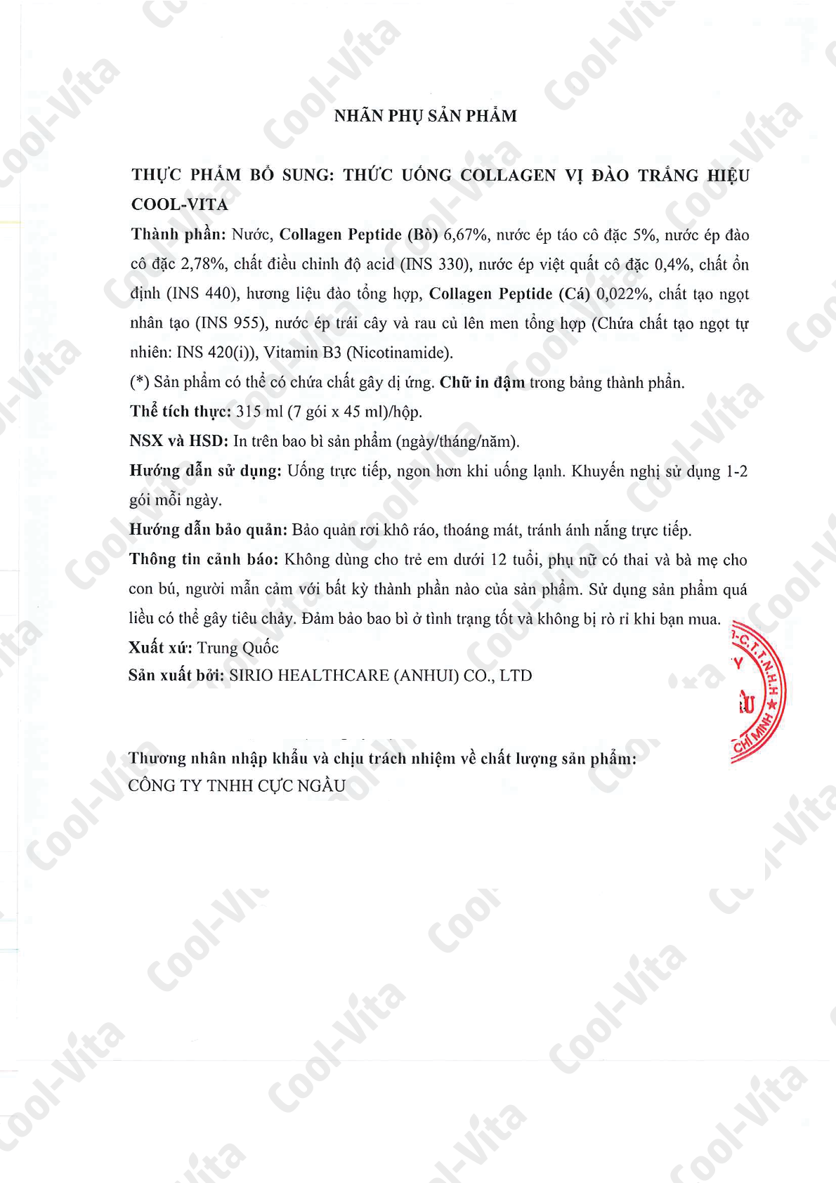• Thành phần: Nước, Collagen Peptide (Bò) 6,67%, nước ép táo cô đặc 5%, nước ép đào cô đặc 2,78%, chất điều chỉnh độ acid (INS 330), nước ép việt quất cô đặc 0,4%, chất ổn định (INS 440), hương liệu đào tổng hợp, Collagen Peptide (Cá) 0,022%, chất tạo ngọt nhân tạo (INS 955), nước ép trái cây và rau củ lên men tổng hợp (Chứa chất tạo ngọt tự nhiên: INS 420(i)), Vitamin B3 (Nicotinamide).