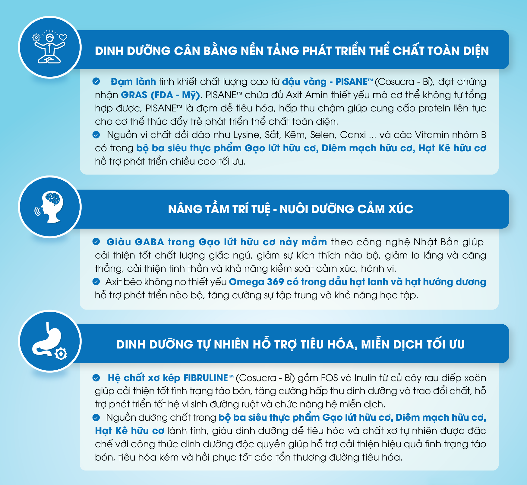 Thay thế bữa ăn phụ hoặc bổ sung cho chế độ ăn hàng ngày thiếu vi chất dinh dưỡng Giúp phát triển trí não và thị giác Giúp phát triển chiều cao Tăng cường sức