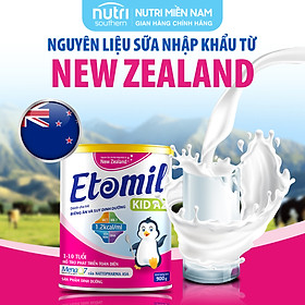 Sữa Tăng Cân Cho Bé 1-10 Tuổi ETOMIL KID AZ - Sữa Năng Lượng Cao Cho Trẻ Biếng Ăn, Nhẹ Cân   THÀNH PHẦN: Năng lượng (Energy) 458 Kcal (1.2kcal/ml), Protein 15g, Chất béo 18g, Axit Linoleic (Omega 6) 1230mg, Axit a-Linoleic (Omega 3) 170mg, Carbohydrate 59g, DHA 12.6mg, MCT 163mg, Choline 52.8mg, Taurine 7.7mg, Lysine 649mg, Colostrum 300mg, MK-7 (MenaQ7) 48mcg, Chất xơ hòa tan (FOS/Inulin) 3000mg, Natri 156mg, Kali 592mg, Canxi 650mg, Photpho 458mg, Magie 65.2mg, Sắt 6.5mg, Kẽm 3.5mg, Đồng 344mcg, Iod 59mcg, Mangan 40.5mcg, Selen 6.1mcg, Vitamin A 1221 IU, Vitamin D3 221IU, Vitamin E 3.2mg, Vitamin K1 34.9mcg, Vitamin C 48.3mg, Vitamin B1 540mcg, Vitamin B2 770mcg, Vitamin B6 380 mcg, Vitamin B12 1.49mcg, Axit Folic 72.7mcg, Axit Pantothenic 3450mcg, Biotin 40.1mcg, Niacin 1300mcg.     CÔNG DỤNG SẢN PHẨM -Etomil Kid AZ là sản phẩm dinh dưỡng dành cho trẻ từ 1 - 10 tuổi. -Etomil Kid AZ đáp ứng nhu cầu năng lượng tăng cao của trẻ biếng ăn, suy dinh dưỡng, giúp cải thiện tình trạng suy dinh dưỡng và mau chóng phục hồi sức khỏe.       ĐỐI TƯỢNG SỬ DỤNG: -Trẻ từ 1 – 10 tuổi. -Đặc biệt thích hợp với: Trẻ suy dinh dưỡng, gầy yếu, biếng ăn. Trẻ cần bổ sung năng lượng, đạm và vi chất vào khẩu phần ăn.   BẢO QUẢN: -Bảo quản nơi khô ráo, sạch sẽ, thoáng mát, tránh ánh nắng trực tiếp. Lon sữa đã mở phải được đóng kín và sử dụng hết trong vòng 3 tuần   NGUỒN GỐC NGUYÊN LIỆU: -Khi nói đến ngành công nghiệp thực phẩm, nguồn gốc nguyên liệu cực kì quan trọng quyết định đến hiệu quả sử dụng, cũng như giá trị của sản phẩm. -Trong sản phẩm Etomil những nguyên liệu sữa và các vitamin, khoáng chất được lựa chọn từ các nhà cung ứng hàng đầu và có uy tín lâu năm trên thế giới từ New Zealand, Na uy và Mỹ. -Đặc biệt MenaQ7 là một thương hiệu duy nhất có thành phần MK-7 (Vitamin K2) được cấp hơn 30 bằng sáng chế tại Mỹ, Châu Âu, Nhật Bản, Australia…và nghiên cứu lâm sàng cho thấy hiệu quả trong việc giúp tăng mật độ xương trên trẻ em và người lớn.   HƯỚNG DẪN SỬ DỤNG: -Pha 5 muỗng gạt (tương đương 48g) với 190ml nước ấm chín được 1 ly khoảng 215ml -Ngày uống 2-3 ly hoặc theo hướng dẫn của cán bộ y tế -Sản phẩm sau khi pha nên cho trẻ ăn ngay và dùng hết trong vòng 1 giờ. Không cho trẻ ăn lại phần thừa của bữa trước.