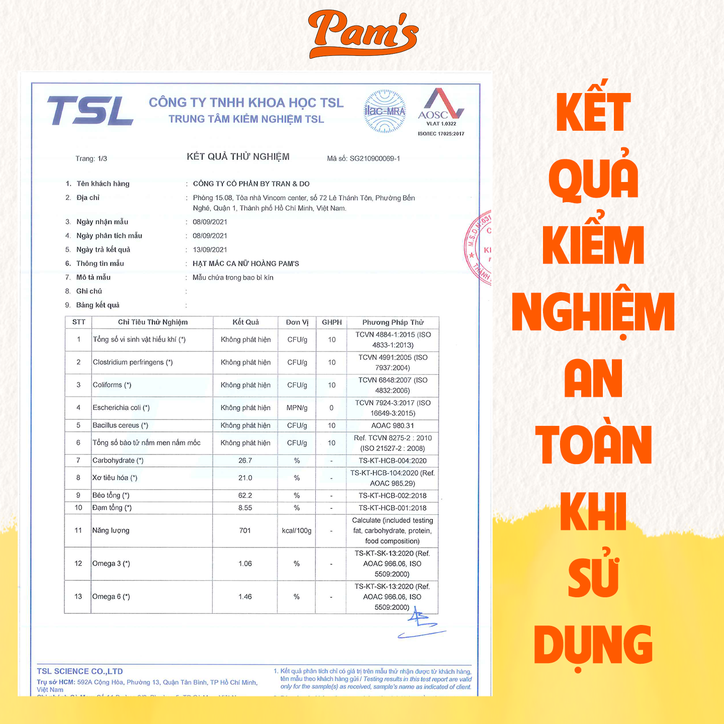 - Hạt Macca Pam's được nhập khẩu chính ngạch và chế biến, đóng gói theo qui trình khép kín chuẩn ISO22000 tại Việt Nam. Hạt Macca thành phẩm đạt chất lượng cao nhất, thơm ngon, bảo toàn các chất dinh dưỡng và khoáng chất trong hạt.