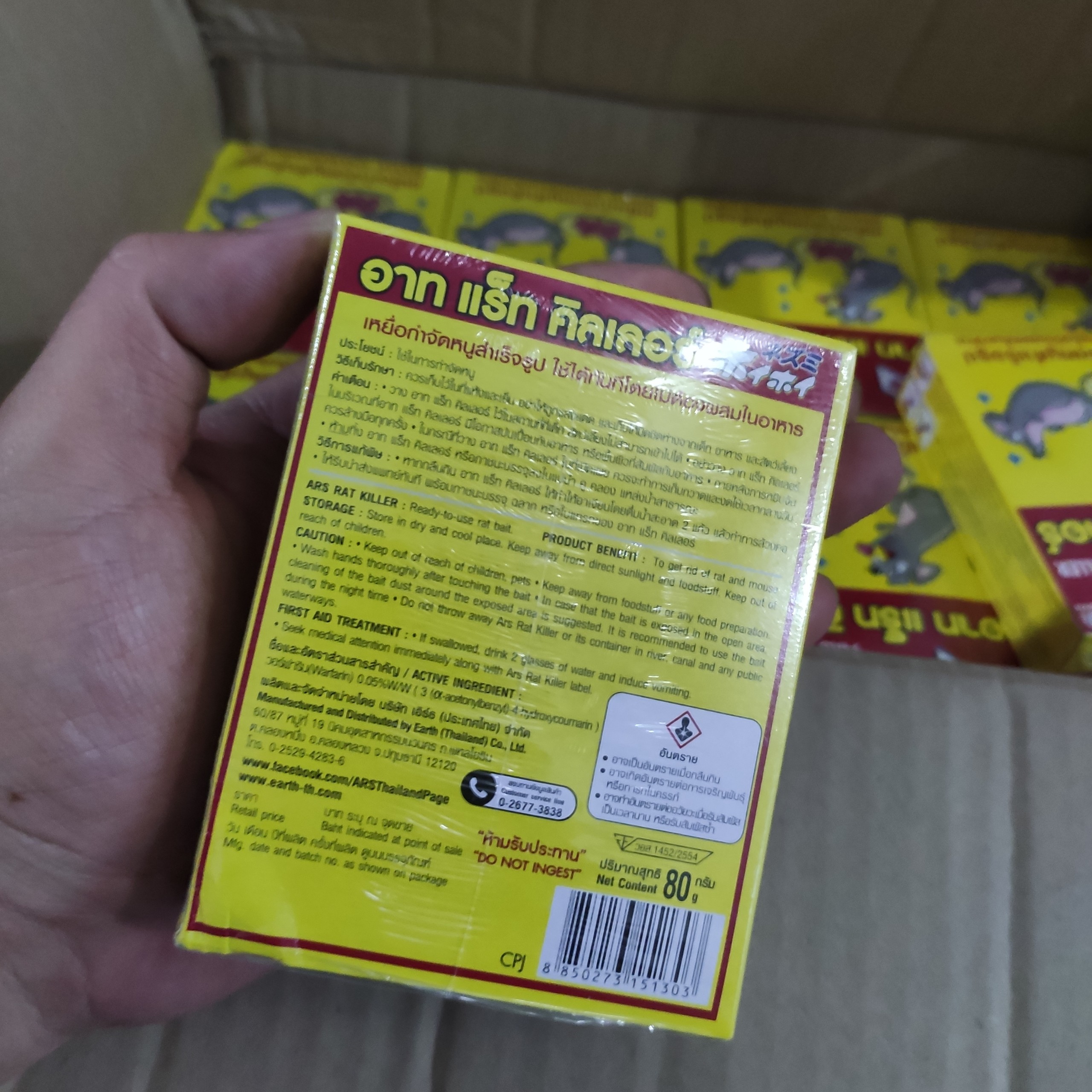 Đây là thuốc diệt chuộc đa liều, Chuột ăn thuốc và chết sau 1 -3 ngày. Sau khi ăn thuốc, chuột không có biểu hiện gì, chúng và đồng loại vẫn tiếp tục ăn mà không đề phòng. Sau 1-3 ngày chúng sẽ chết. Vì thế hiệu quả diệt cả đàn chuột là rất cao. Thuốc diệt chuột dễ dàng tiêu diệt cả đàn chuột – nhập trực tiếp từ Thái Lan Trọng lượng: 80gr. Quy cách: 1 hộp – Công dụng: Đây là thuốc diệt chuộc đa liều, Chuột ăn thuốc và chết sau 1 -3 ngày. Sau khi ăn thuốc, chuột không có biểu hiện gì, chúng và đồng loại vẫn tiếp tục ăn mà không đề phòng. Sau 1-3 ngày chúng sẽ chết. Vì thế hiệu quả diệt cả đàn chuột là rất cao. – ƯU ĐIỂM: chuột sẽ tìm ra nơi có ánh sáng hoặc nguồn nước để chết. Và bạn sẽ không còn lỗi lo chuột chết ở một góc nào đó trong nhà bạn, nhờ đó mà việc làm vệ sinh, dọn dẹp sau khi chuột chết vô cùng dễ dàng. HƯỚNG DẪN SỬ DỤNG: – Bóc lớp bọc hộp thuốc, đặt ở nơi có nhiều chuột. Đặt cả khay chứ không lấy thuốc ra đặt riêng. – Nên đặt thuốc ở nơi tối, ẩm, chuột hay xuất hiện hoặc trên đường đi kiếm ăn hàng ngày của chúng. – Viên thức ăn diệt chuột đặt viên thức ăn này vào nơi có chuột qua lại, chuột sẽ ăn hoặc tha mồi về tổ rồi ăn cùng chết ở tổ của chúng. – Hoặc có thể trộn chúng với thức ăn thừa, cơm hoặc thóc ngâm Luy ý: – Bảo quản sản phẩm nơi khô ráo, thoáng mát. – Tránh xa nguồn lương thực, thực phẩm, thức ăn gia súc; xa tầm tay trẻ em – Nếu nuốt phải, cần đưa nạn nhân đến bác sĩ ngay kèm theo nhãn sản phẩm.