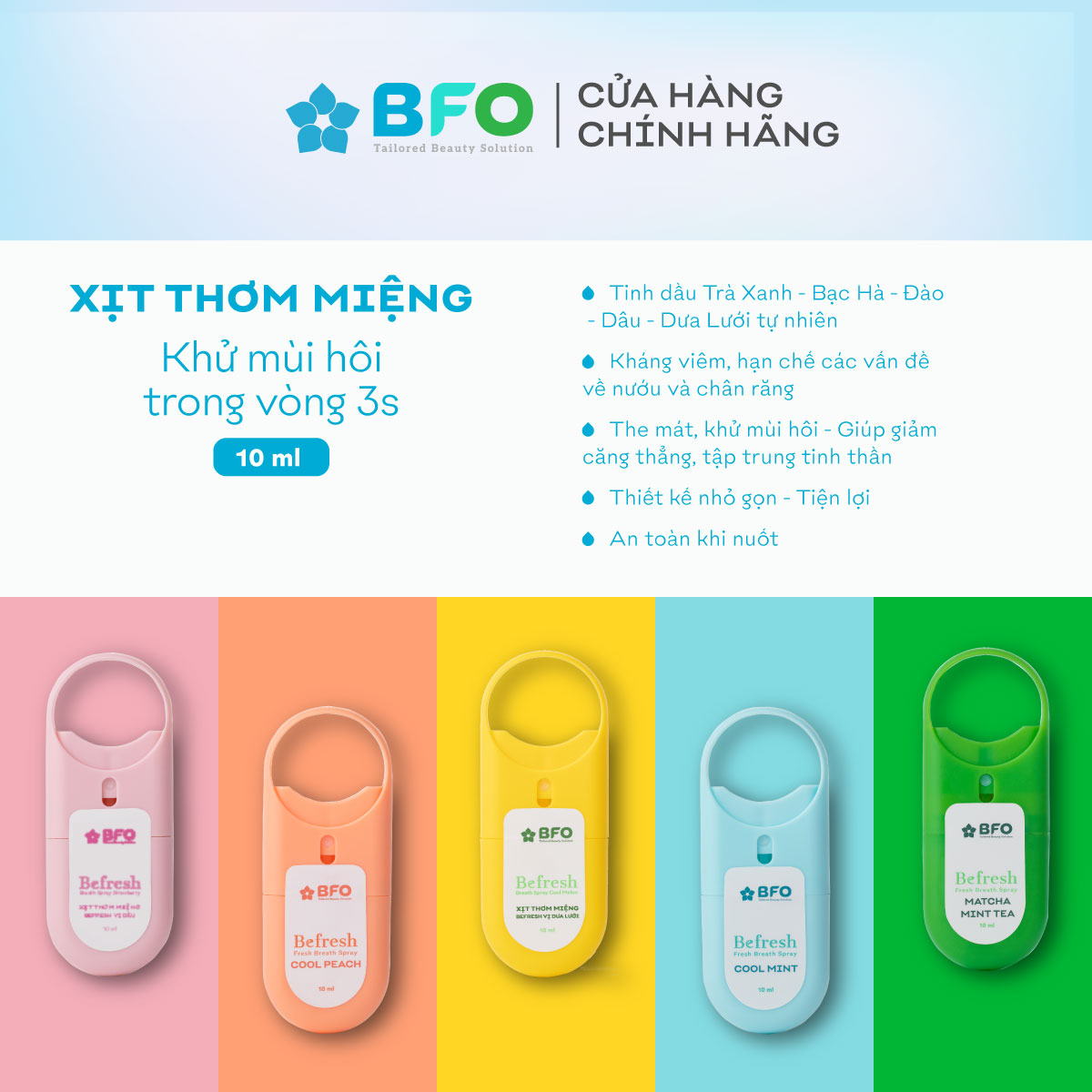 Combo 2 Xịt Thơm Miệng Befresh Cho Hơi Thở Thơm Mát Chỉ Trong 3 Giây Dung Tích 10ml ƯU ĐIỂM NỔI BẬT: Khử mùi hôi trong khoang miệng nhanh chóng chỉ trong 3 giây, giúp hơi thở thơm mát, sảng khoái. Chiết xuất từ tinh dầu trà xanh - bạc hà hoàn toàn thiên nhiên, cho hương thơm tự nhiên, không nồng, không khó chịu, an toàn khi nuốt. Thiết kế nhỏ gọn, tiện lợi, luôn sẵn sàng bên bạn trong bất kỳ cuộc hẹn nào. Sản phẩm không thể thay thế kem đánh răng và nước súc miệng, do đó bạn nên kết hợp đánh răng, súc miệng và xịt miệng để đảm bảo sức khỏe răng miệng và tự tin với khoang miệng sạch thơm suốt ngày dài. THÀNH PHẦN: Tinh dầu bạc hà có công dụng khử mùi hôi, hỗ trợ làm sạch răng miệng. Tinh dầu trà xanh giúp ngăn ngừa sâu răng, hạn chế các vấn đề về nướu và chân răng. Vị the mát sảng khoái giúp giảm căng thẳng, tăng cường năng lượng, kích thích sự tập trung tinh thần. MÙI HƯƠNG 4 LOẠI: VỊ ĐÀO ️ VỊ DÂU BẠC HÀ TRÀ XANH - BẠC HÀ DƯA LƯỚI HƯỚNG DẪN BẢO QUẢN: Đậy nắp kín sau khi sử dụng. Bảo quản nơi khô ráo, thoáng mát. Tránh nhiệt độ cao. Tránh ánh nắng trực tiếp. Xuất xứ: Việt Nam THÔNG TIN THƯƠNG HIỆU: Thương hiệu BFO: Tự hào là chuỗi cửa hàng cung cấp các sản phẩm chăm sóc và làm đẹp toàn diện, giá tốt, chất lượng độc tôn trên toàn Châu Á. Với niềm tin mãnh liệt trong từng sản phẩm tạo ra, BFO hy vọng mang lại những trải nghiệm tốt nhất cho người tiêu dùng: HIỆU QUẢ - TỐI GIẢN - THOẢI MÁI.