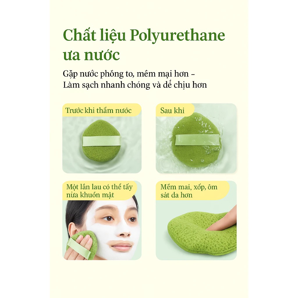 - Khác biệt so với các loại miếng rửa mặt thông thường, bông mút được làm từ bọt biển mềm mại, không làm tổn thương da. Đặc biệt, thiết kế dạng giọt nước giúp dễ luồn lách vào các vùng da nhỏ như hai bên cánh mũi hay viền mắt, giúp làm sạch toàn diện. Mút còn có khả năng tạo bọt cực tốt, giúp sữa rửa mặt phát huy tối đa hiệu quả mà không làm khô da.
