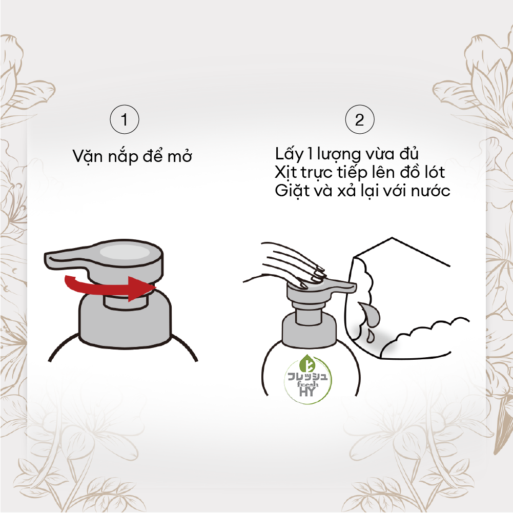 Công thức gốc thực vật, bảo vệ da tay mềm mại; không gây kích ứng Cách sử dụng: Thích hợp dùng cho cả giặt tay và giặt máy: Giặt tay: Đối với vết bẩn cứng đầu, xịt trực tiếp 1 lượng vừa đủ lên vết bẩn trong một khoảng thời gian, sau đó rửa sạch lại với nước. Đối với vết bẩn thông thường, hòa tan 10ml nước giặt với 500ml nước ấm (nếu có), ngâm đồ lót trong khoảng 20 phút rồi giặt sạch lại với nước. Giặt máy: Xịt trước tiếp 1 lượng vừa đủ nước giặt lên vết bẩn, chà xát nhẹ nhàng sau đó bắt đầu chu trình giặt máy như bình thường. Lưu ý: không sử dụng cho lụa, len, và rayon Cảnh báo: Tránh xa tầm tay trẻ em Tránh xa mắt. Nếu bị dính vào mắt, rửa ngay với nước sạch và tư vấn với bác sĩ . Để tránh ánh sáng mặt trời