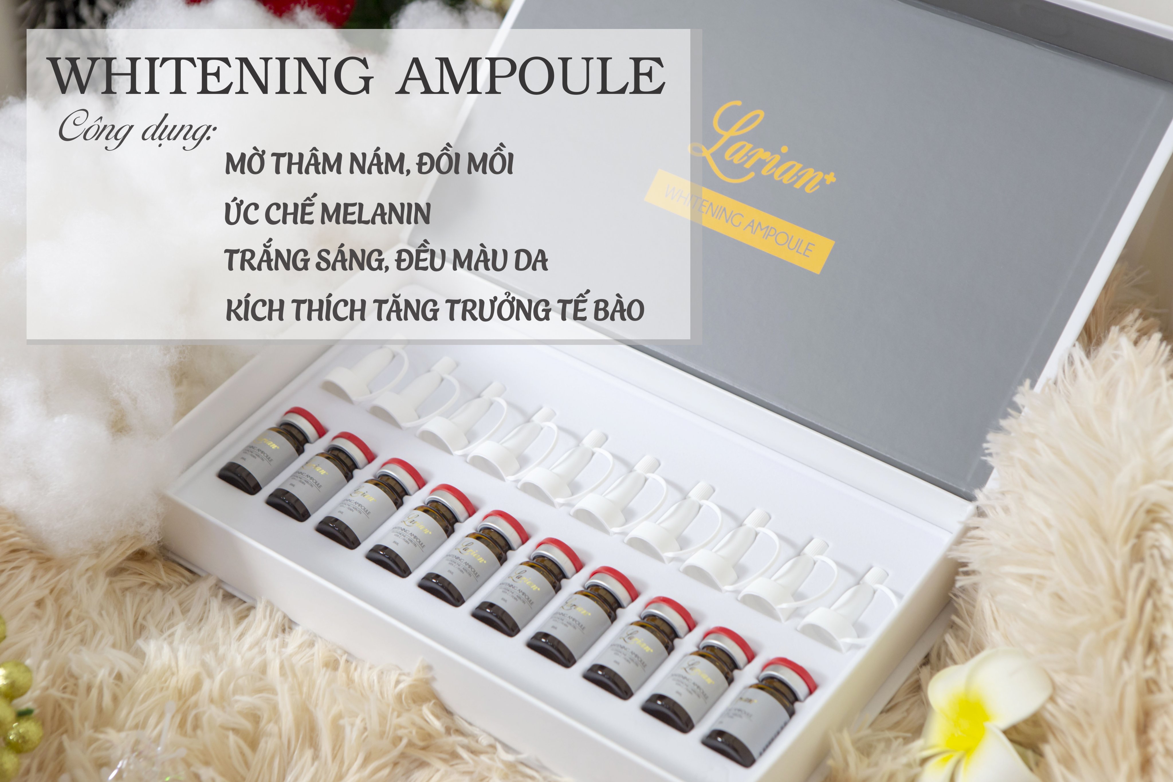 Whitening Ampoule giúp ức chế sản xuất melanin, mờ thâm nám, tàn nhang. Cung cấp các dưỡng chất làm trắng sáng da, đồng đều màu da. Tái tạo, phục hồi da bị tổn thương, da bị tăng sắc tố do sử dụng các loại mỹ phẩm nhiễm coticoir, do lăn kim, phi kim, laser…. Whitening ampoule cung cấp các axit amin cần thiết giúp kích thích sản sinh các tế bào da mới cho làn da khỏe mạnh và làm giảm hiệu quả tình trạng nám, tàn nhang, các đốm đen, vết chân chim, các vùng da không đều màu, nuôi dưỡng da trắng sáng từ sâu bên trong. Sử dụng thường xuyên giúp bổ sung độ ẩm cho da, tạo lớp hàng rào bảo vệ giúp da tránh khỏi tình trạng mất nước, thô ráp, bong tróc, se khít lỗ chân lông, tăng cường độ đàn hồi cũng như xóa mờ các nếp nhăn…