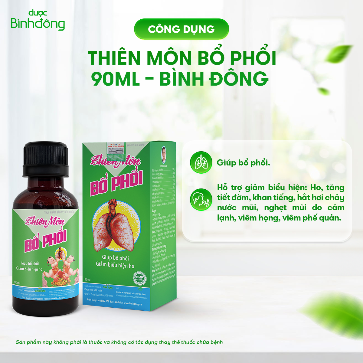 Thiên Môn Bổ Phổi của Dược Bình Đông – Chai 90ml dành cho Trẻ em - Bổ phổi, tăng cường sức đề kháng, giảm ho cho trẻ ✓ Trẻ nhỏ là đối tượng dễ bị tác động từ môi trường dễ sinh cảm ho, viêm họng, viêm phế quản. ✓ Vì vậy, Thiên Môn Bổ Phổi Trẻ Em chính là giải pháp giúp mẹ bảo vệ trẻ hữu hiệu. ✓ Thiên Môn Bổ Phổi Trẻ Em chiết xuất từ 100% thảo dược thiên nhiên, là thực phẩm bảo vệ sức khỏe mang lại tác dụng tốt trong việc: