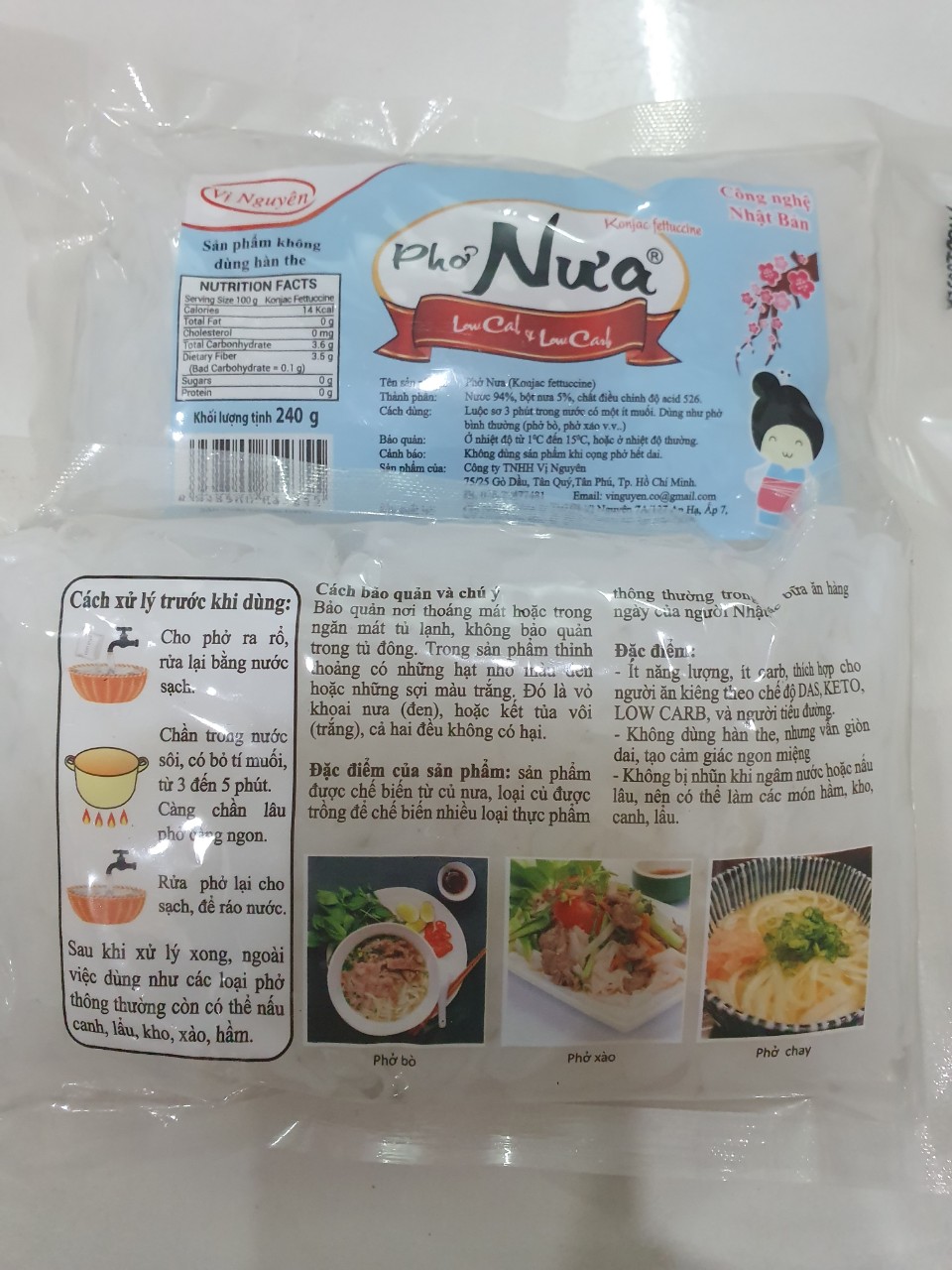 - Bảo quản: Nơi thoáng mát Những thực phẩm được làm từ bột Glucomanna có trong củ nưa, một chất xơ chứ không phải là tinh bột. Sản phẩm được sản xuất theo công nghệ Nhật Bản, không chất bảo quản. ️ THÀNH PHẦN: Phở nưa chiếm 97% chất xơ. Năng lượng 5-30kCal/100g ️ Cách sơ chế: mở hộp đổ bỏ nước muối ngâm, rửa qua bằng nước, thả vào nước sôi cho sôi lại 3-5′. Sau đó có thể chế biến đa dạng như Phở bình thường như làm Phở trộn, Phở xào, hoặc Phở nước, đặc biệt ăn lẩu với Phở cực chuẩn, vì đặc trưng của em nó là càng nấu lâu càng ngấm gia vị, đặc biệt là không hề trương hay nhũn, luôn luôn dai ngon. Phở có hàm lượng chất xơ rất cao, là loại củ có thành phần dinh dưỡng là 0 carb from sugar và gần như 0 kcal. phù hợp với mọi lứa tuổi, mọi chế độ ăn kiêng, kể cả DAS, Lowcarb.