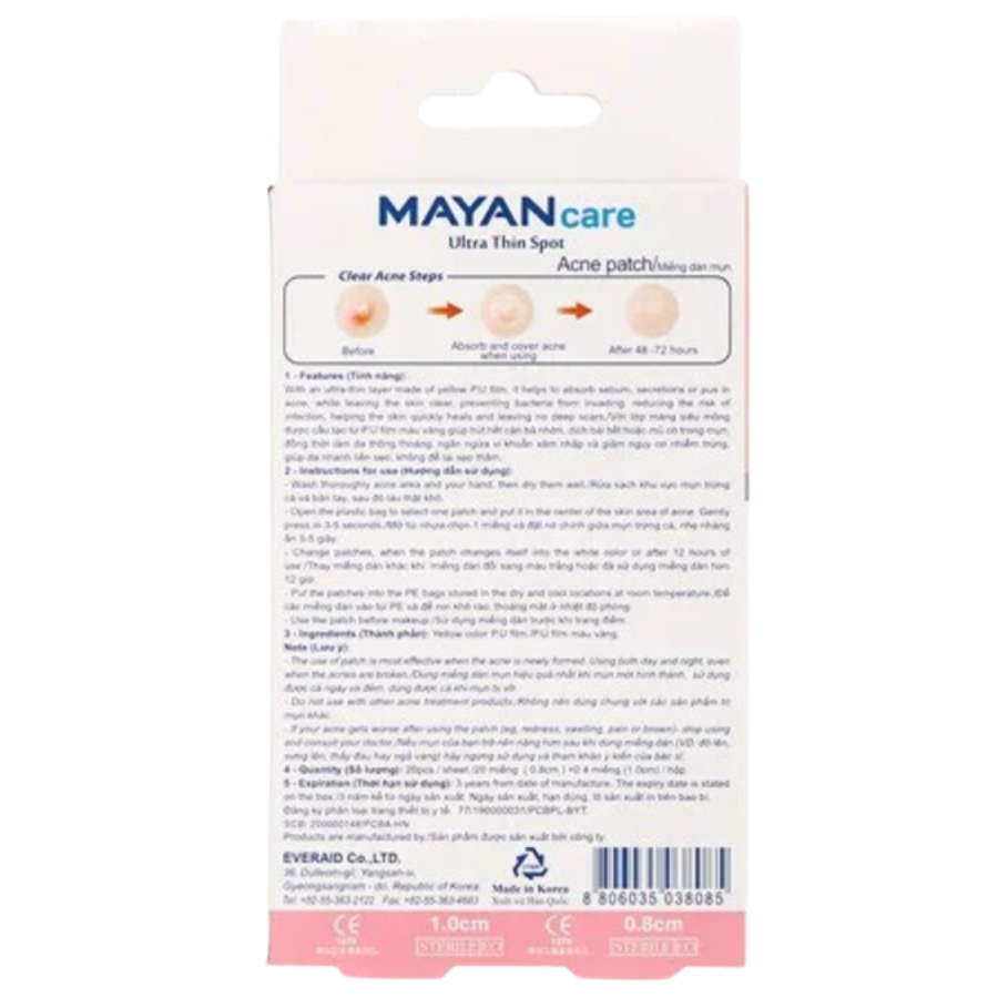 Miếng Dán Mụn Mayancare 20 miếng Miếng Dán Mụn Mayancare 20 miếng có tác dụng trên các loại: mụn trứng cá, mụn viêm, mụn có mủ. Miếng dán giúp hút mụn nhanh chóng, không thấm