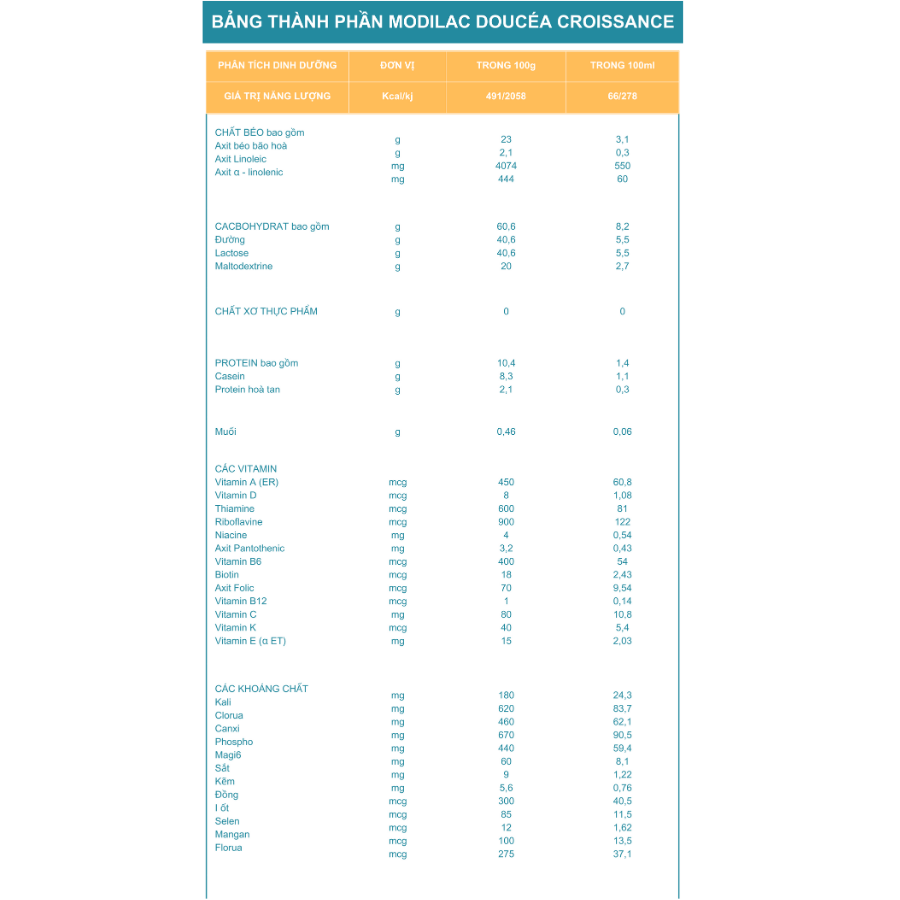• Mỗi lon sữa Modilac Doucéa đều trải qua hơn 40 năm cải tiến không ngừng, phù hợp với sự phát triển của bé.