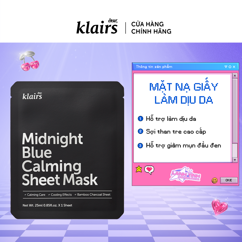 1. Dear, Klairs Mặt nạ giấy Midnight Blue Calming Sheet Mask 25ml   Thành phần: Water, Butylene Glycol, Methylpropanediol, Glycereth-26, 1,2 Hexanediol, Salix Alba (Willow) Bark Extract, Glycerin, Erythritol, Arginine, Carbomer, Carrageenan, Betaine, Allantoin, Ethylhexylglycerin, Propanediol, Polyglyceryl-10 Laurate, Glyceryl Acrylate/Acrylic Acid Copolymer, PVM/MA Copolymer, Disodium EDTA, Dipotassium Glycyrrhizate, Melaleuca Alternifolia (Tea Tree) Leaf Oil, Centella Asiatica Extract   - Công dụng: Giúp làm dịu da, giảm kích ứng và làm mát da, đặc biệt là những làn da bị nóng, rát do tiếp xúc với ánh nắng mặt trời; phù hợp với cả những làn da nhạy cảm. Ngăn ngừa sự tiết bã nhờn của da làm to lỗ chân lông và giảm thiểu sự hình thành mụn đầu đen nhờ than tre hoạt tính, rau má và chiết xuất cây liễu.   - Loại da: da dễ bị nóng đỏ, kích ứng/ da nhờn/ da sau tổn thương.   - Hướng dẫn sử dụng: Sau khi rửa mặt, có thể sử dụng sau nước hoa hồng để đạt hiệu quả tốt, đắp mặt nạ 15 - 20 phút rồi gỡ mặt nạ ra, nhẹ nhàng massage cho dưỡng chất thấm vào da. Không nên rửa lại với nước. Có thể dùng thêm tinh chất hoặc kem dưỡng sau khi đắp mặt nạ tùy ý. Sử dụng 1-2 lần/ tuần để đạt hiệu quả tốt.
