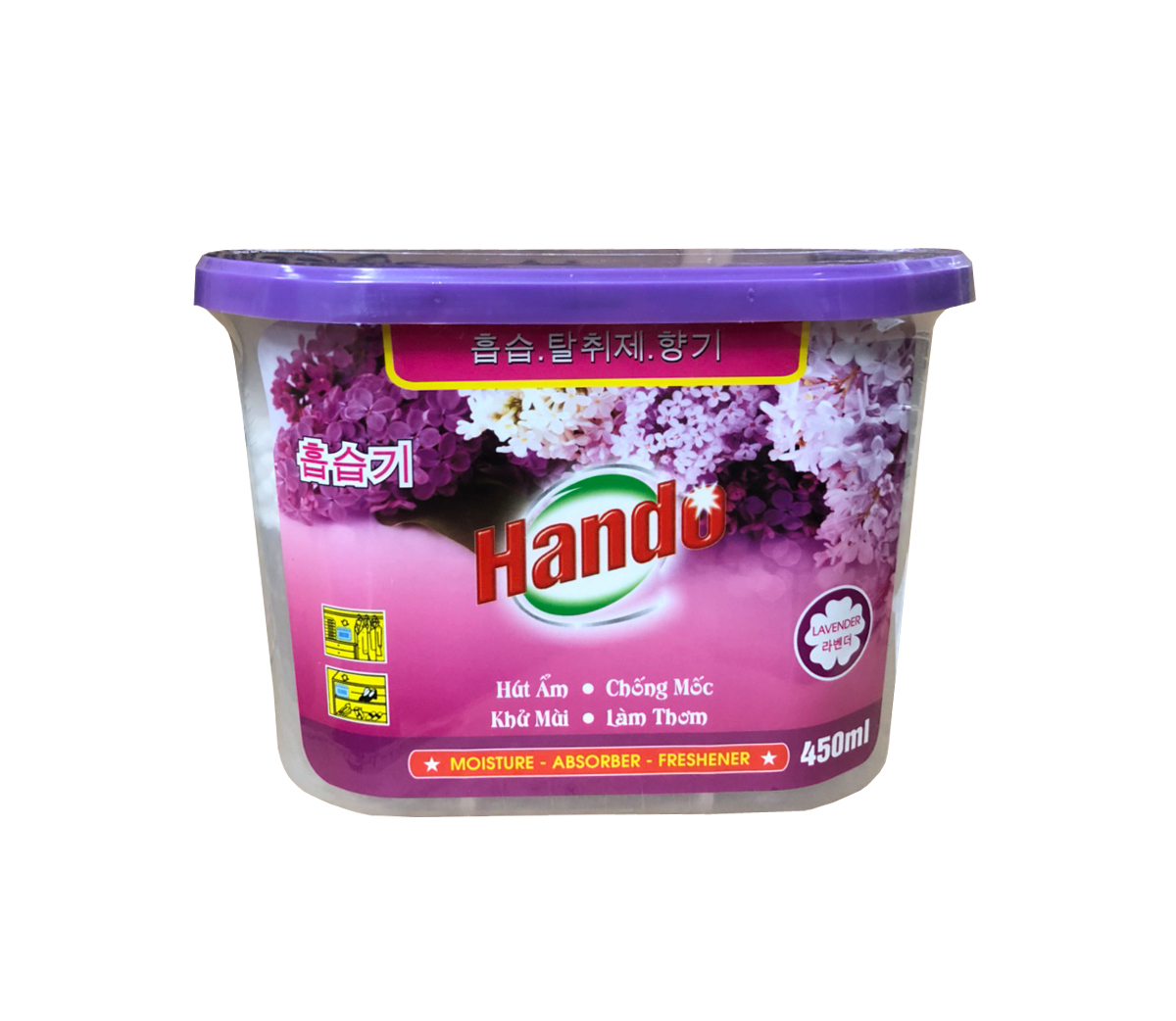 Thông số sản phẩmTên sản phẩm : Bình hút ẩm Hando 450mlHướng dẫn sử dụng    : Mở nắp, lột bỏ lớp giấy bạc, giữ lớp giấy thấm và để nơi mình muốn. Không làm rách lớp giấy thấm, thay bình khác khi mực nước xấp xỉ nửa bình.Hướng dẫn bảo quản : Bảo quản nơi khô ráo, thoáng mát, tránh xa tầm với của trẻ em và không ăn đượcThành phần : Calcium super, fragance pelleet, chất chống ẩm mốc, khử mùi…Công dụng : Hút ẩm, chống mốc, giữ đồ vật khô ráo và khử mùi chua mốc hiệu quảDung tích : 450 (ml)Xuất xứ : Việt Nam Bình hút ẩm Hando khiến việc bảo quản đồ đạc trở nên dễ dàng hơn rất nhiều. Chỉ cần bóc lớp giấy bóng bảo vệ ra rồi nắp lại như cũ, sau đó đặt vào nơi mình muốn hút ẩm, qua 1 thời gian không khí ẩm sẽ bị hút vào bình, khi bình đầy nước thì thay bằng bình khác là xong. Sản phẩm có thể đặt trong tủ quần áo, tủ thuốc, tủ giày dép, tủ bếp, tủ rượu và các góc chứa đồ có khả năng bị ẩm, mốc.