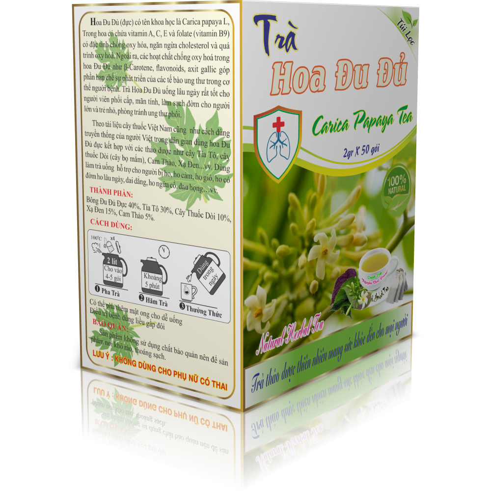 TRÀ HOA ĐU ĐỦ      Hoa Đu Đủ (đực) có tên khoa học là Carica papaya L, Trong hoa có chứa vitamin A, C, E và folate (vitamin B9) có đặc tính chống oxy hóa, ngăn ngừa cholesterol và quá trình oxy hoá. Ngoài ra, các hoạt chất chống oxy hoá trong hoa đu đủ như β-Carotene, flavonoids, axit gallic góp phần hạn chế sự phát triển của các tế bào ung thư trong cơ thể người bệnh. Trà Hoa Đu Đủ uống lâu ngày rất tốt cho người viên phổi cấp, mãn tính, làm sạch đờm cho người lớn và trẻ nhỏ, phòng tránh ung thư phổi. Theo tài liệu cây thuốc Việt Nam cũng  như cách dùng truyền thống của người Việt trong dân gian dùng hoa Đu Đủ đực kết hợp với các thảo dược như cây Tía Tô, cây thuốc Dòi (cây bọ mắm), Cam Thảo, Xạ Đen...vv. Dùng làm trà uống  hỗ trợ cho người bị ho, ho cảm, ho gió, ho có đờm ho lâu ngày, dai dẳng, ho ngứa cổ, đau họng…vv. THÀNH PHẦN: Hoa Đu Đủ ( Đực ) 40 %,  Cây Tía Tô  30 %, Cây Thuốc Dòi  10%, Xạ Đen   15 %   Cam Thảo 5% CÁCH DÙNG: cho túi trà vào tách nước sôi 100 độ C ( 150 ML nước ) đậy kín lại khoảng 3 đến 5 phút là dung được, cách tốt nhất cho từ 5 đến 8 túi trà vào bình thủy hãm uống trong ngày (Trà Thảo Dược nên dùng ấm sẽ cho hiệu quả tốt nhất ). Hỗ trợ bệnh thì dùng liều gấp đôi , có thể pha chung với mật ong rất tốt. BẢO QUẢN: Vì không sử dụng hóa chất bảo quản nên để hộp trà nơi khô ráo, thoáng sạch. SẢN XUẤT TẠI: DNTT Trà Thảo Dược Nguyên Thái Trang 01 Phan Đình Phùng, Phường 1, Tp. Đà Lạt, Lâm Đồng HẠN SỬ DỤNG: