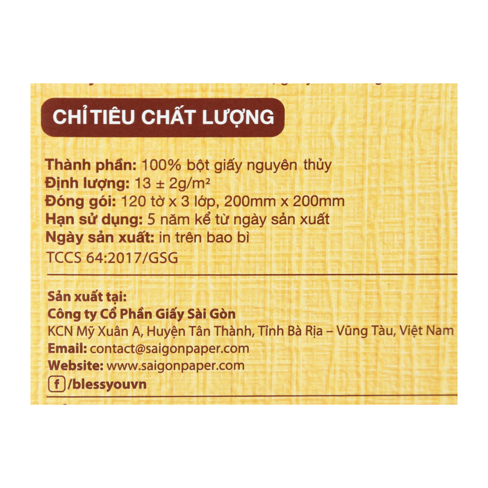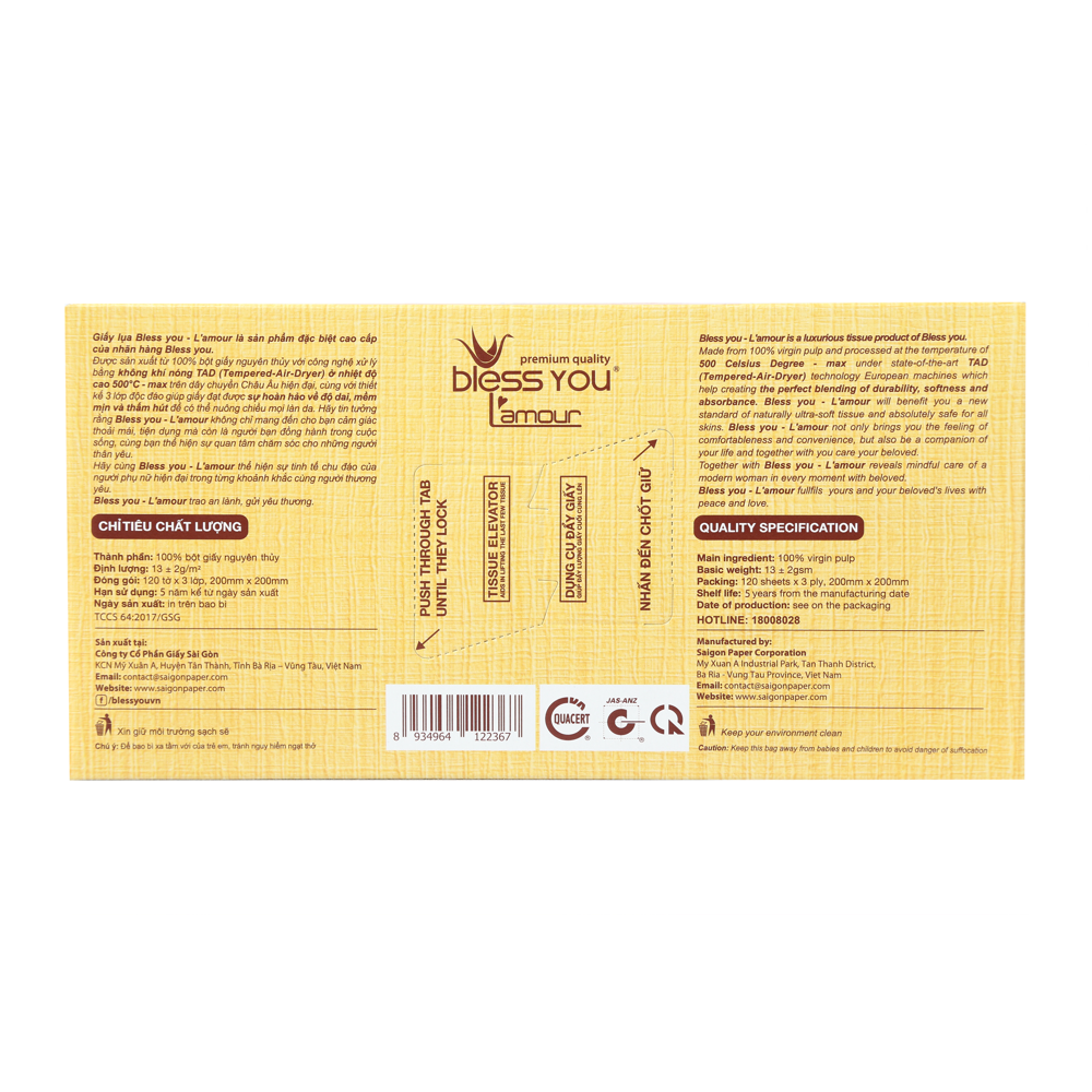 Mua tại TiktokKhăn giấy Bless You Lamour nổi bật với chất liệu mềm mại mang lại cảm giác thoải mái khi sử dụng. Sản phẩm được làm từ nguyên liệu tự nhiên, không chứa chất tẩy trắng, đảm bảo an toàn cho làn da. Công nghệ sản xuất hiện đại giúp giấy mềm mại, thấm hút và dai. Thiết kế đựng trong hộp tiện lợi, dễ dàng sử dụng và bảo quản. Hơn nữa, giá cả hợp lý giúp bạn dễ dàng lựa chọn cho gia đình. Bless You là sự kết hợp hoàn hảo giữa chất lượng và giá trị, thực sự là lựa chọn tiện dụng cho mọi nhà. Nhãn hiệu: Bless You Thành phần: 100% bột gỗ nguyên chất (Virgin pulp) Định lượng: 13 gsm Số lớp: 3 Số tờ: 120 tờ Kích thước giấy: 200mm x 200mm