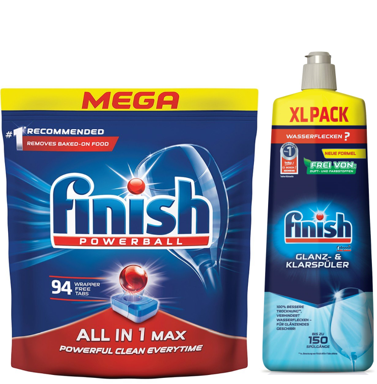 Combo: Viên rửa bát Finish 110 viên + nước làm bóng finish 800ml - Là combo chất tẩy rửa "Đơn giản và Hiệu quả", thương hiệu của CHLB Đức và sản xuất tại Liên minh