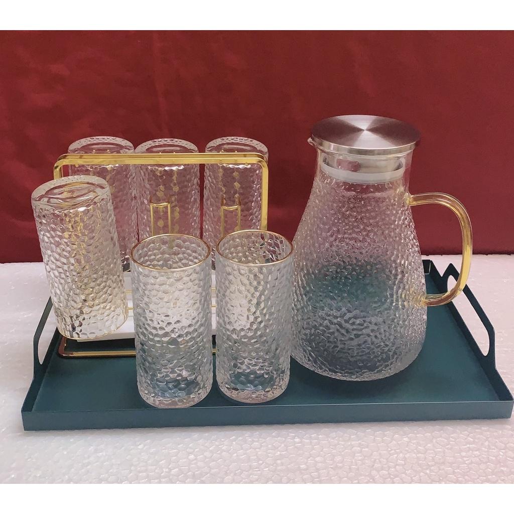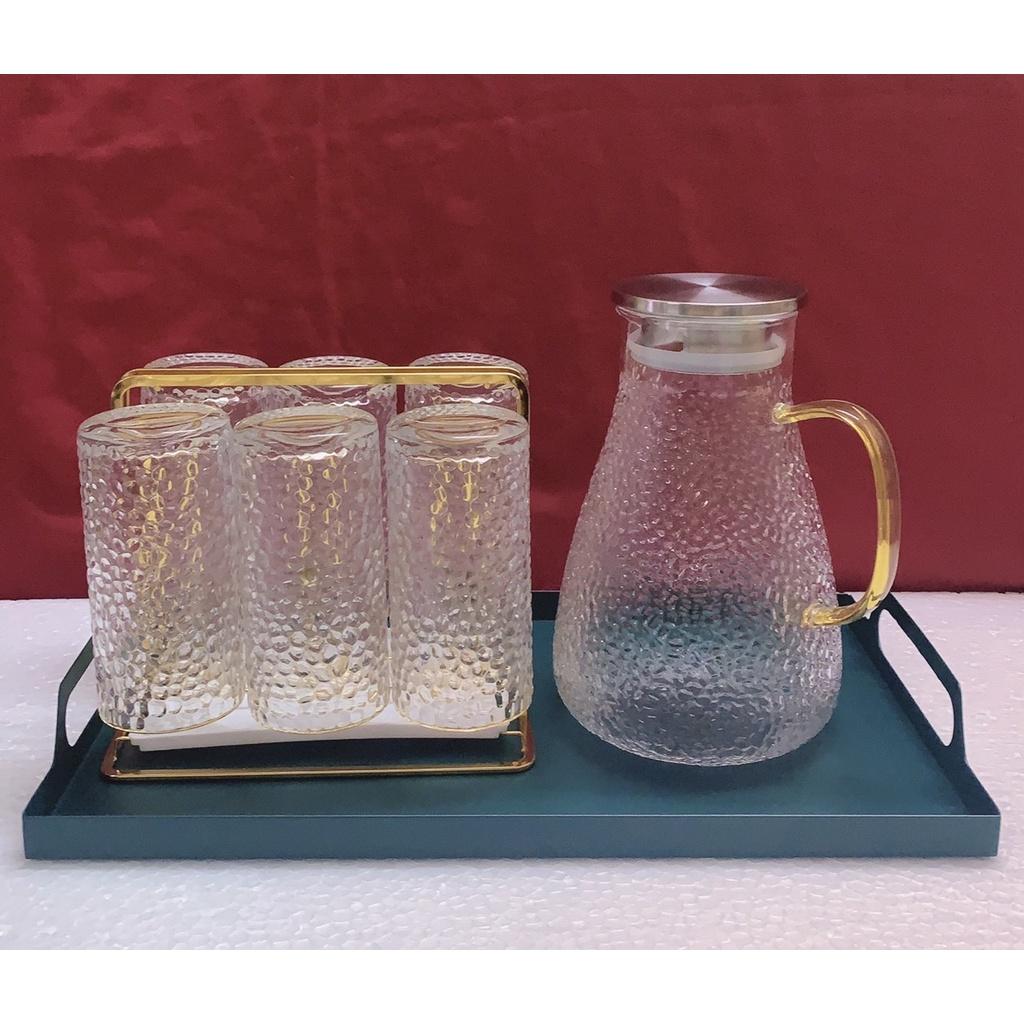 Giá sản phẩm được quy theo các phân loại sau, quý khách vui lòng đọc kĩ các combo phân loại nhé: ️Mô tả: 1 - Bộ combo Gồm 1 bình thủy tinh vân sần 1800ml & 6 cốc thủy tinh + 1 khay kim loại xanh + 1 giá úp cốc kim loại mạ vàng. 2 - Bộ 6 cốc sần nổi viền vàng. 3 - Bình đựng nước uống thủy tinh tháp vân sần 1800ml 4 - Khay kim loại xanh 5- Khay gỗ xanh 6 - Giá úp cốc -Bình dung tích 1800ml. Nắp inox có zoăng cao su, đảm bảo an toàn cho sức khoẻ, thiết kế roong khit nắp chặt không lo bị rớt khi rót cạn nước
