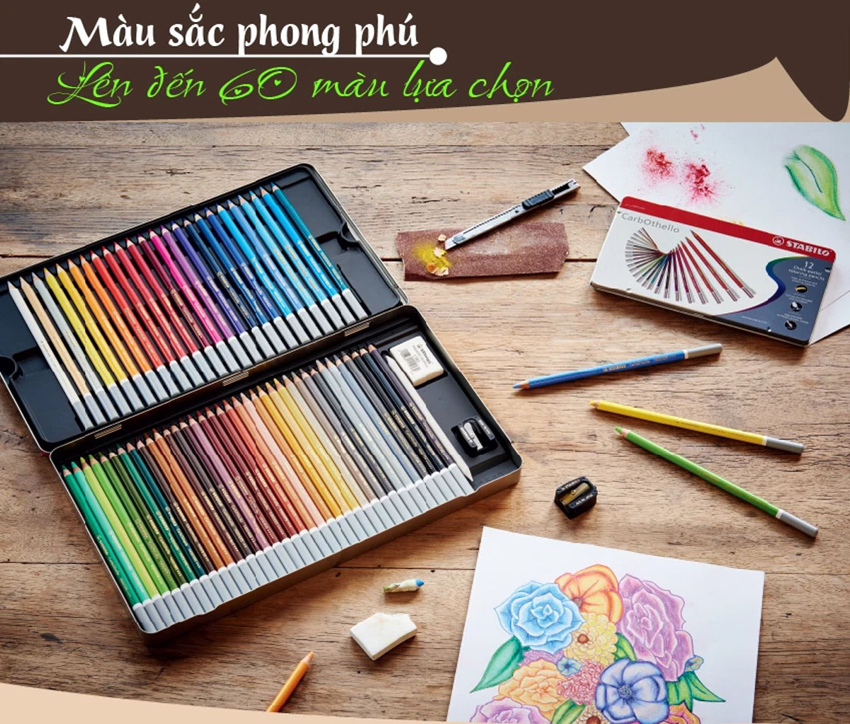 ✨Combo bút chì màu đa năng STABILO Carbothello 24 màu - Hộp thiếc 24 màu + Tuyển tập tô màu SVCB (CLC1424MB)