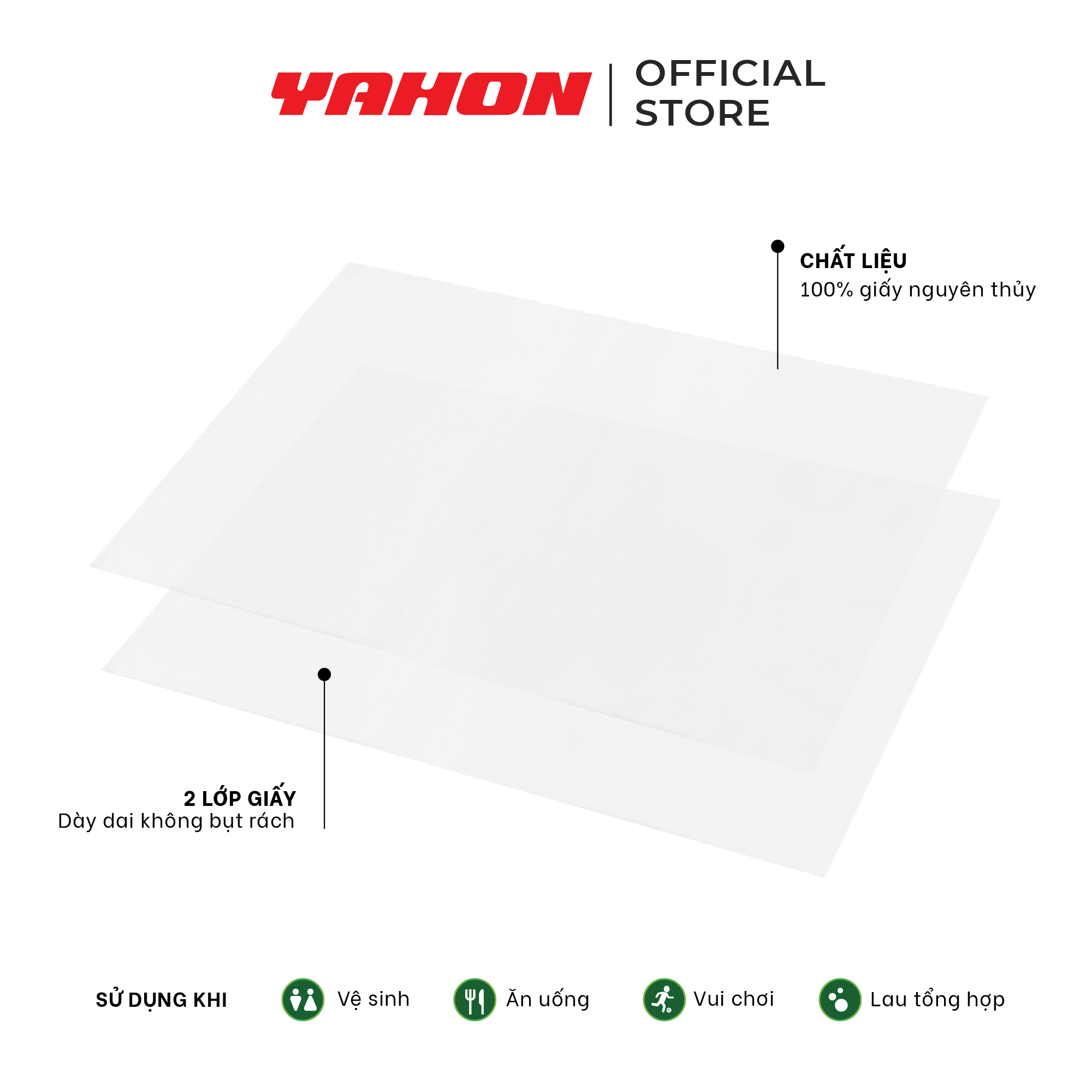 à sản phẩm cao cấp của công ty giấy Mylan Thành phần chính 100% bột giấy nguyên thủy Quy cách đóng gói: 10 cuộn/dây, 3 lớp Kích thước mỗi tờ giấy:100mm x 100mm ± 4mm