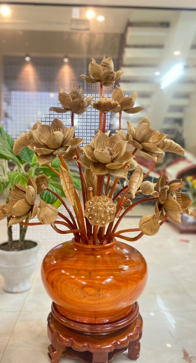 _ 1 bình hoa sen 21 cành trang trí ,phòng khách ,phòng thờ được làm bằng chất liệu gỗ hương đỏ tự nhiên 100% _ Kt bình cắm 23×22cm+ hoa lá gương cao tổng 85cm