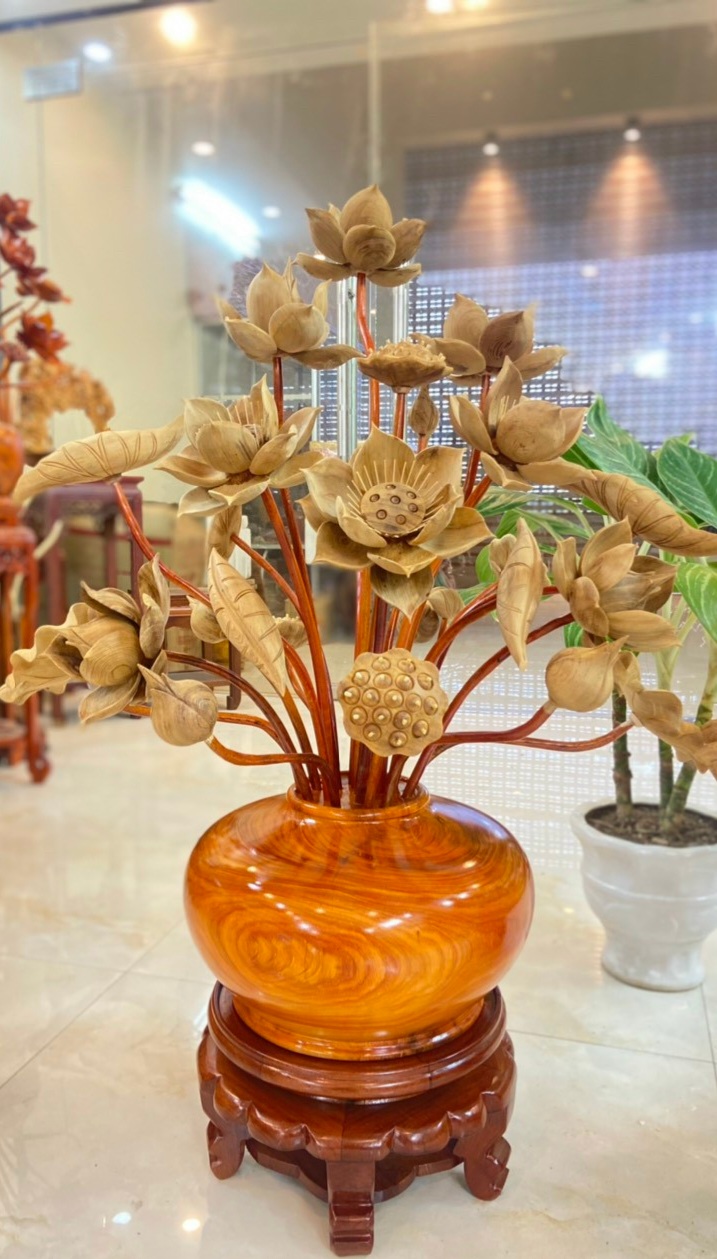 _ Bình hoa sen trang trí phòng khách ,phòng thờ được làm bằng chất liệu gỗ hương đỏ tự nhiên 100%  _ Kt bình cắm 30×25cm ,kt cao tổng kể cả  hoa lá gương 92cm