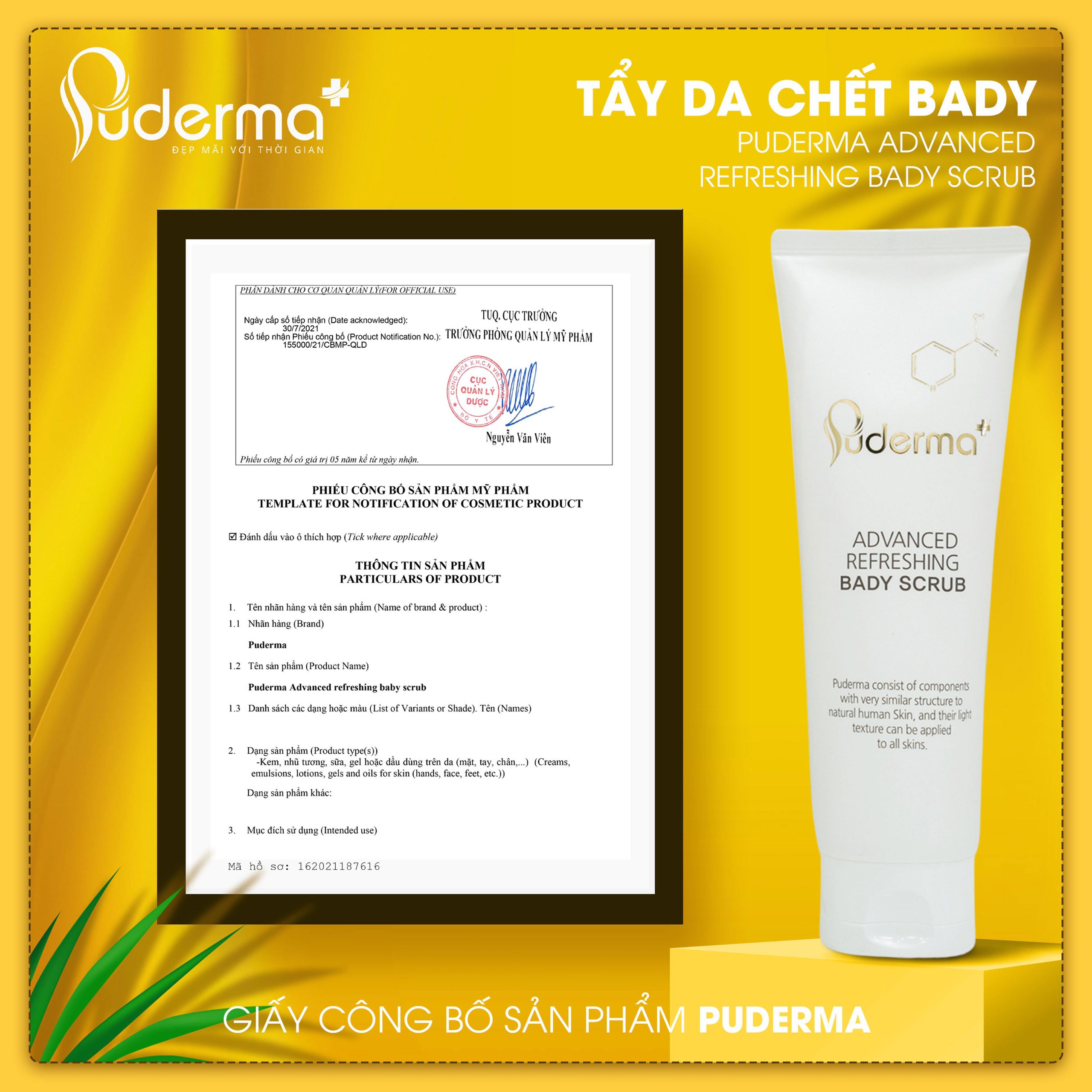 - Tẩy da chết Puderma Advanced Refreshing giúp làm sạch tế bào da chết trên da, mang lại làn da mịn màng, tươi sáng.
