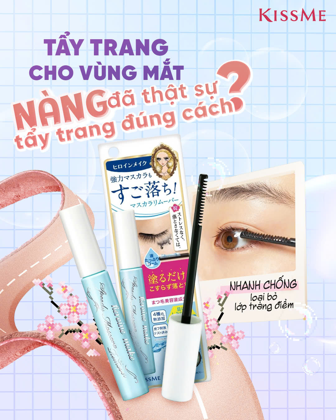 Mascara Tẩy Trang Mắt Kissme Heroine Make (7.3mL) Xuất xứ: Nhật Bản Thương hiệu: Kissme Mã vạch: 4901433040082 HSD: 5 năm kể từ NSX Dung dịch tẩy trang mi sẽ hòa tan ngay lập bởi