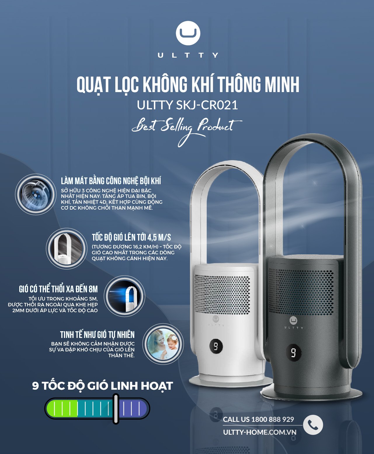 • Sở hữu 3 công nghệ làm mát hiện đại bậc nhất hiện nay: tăng áp tua bin, bội khí, tản nhiệt 4D, kết hợp cùng động cơ DC không chổi than mạnh mẽ, Ultty SKJ-CR021 tạo ra tốc độ gió lên tới 4,5 m/s (tương đương 16,2 km/h), cao nhất trong các dòng quạt không cánh hiện nay. Gió thổi ra mềm mại tinh tế như gió tự nhiên, có thể thổi xa đến 8m, bạn sẽ không cảm nhận được sự va đập khó chịu của gió lên thân thể như quạt truyền thống