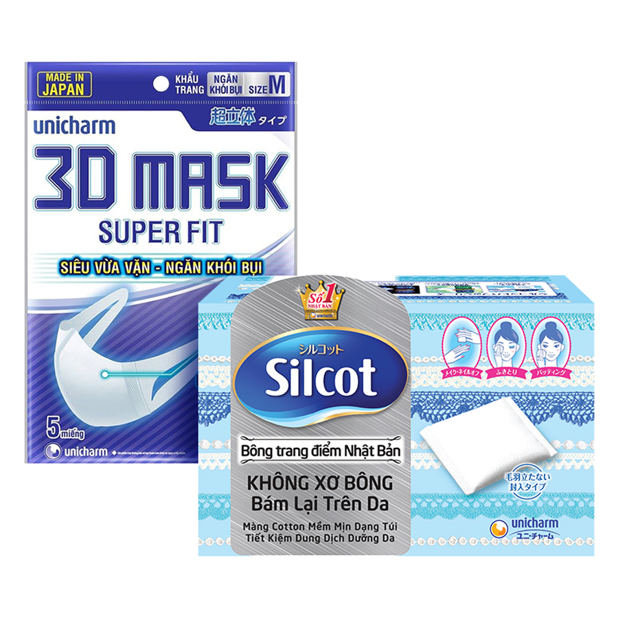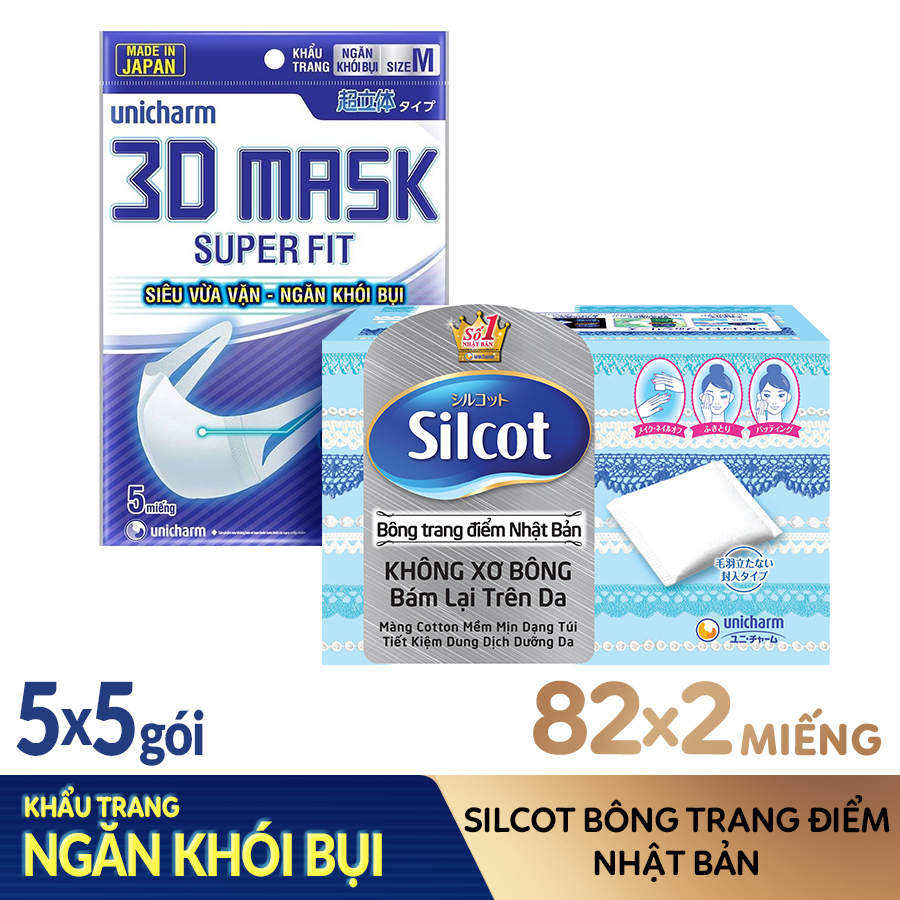 ✨Combo Ngăn Bụi Toàn Diện Gồm 2 Hộp Silcot Bông Trang Điểm (bông tẩy trang) Nhật Bản + 5 Gói Khẩu Trang Ngăn Khói Bụi Unicharm 3D Mask Super Fit