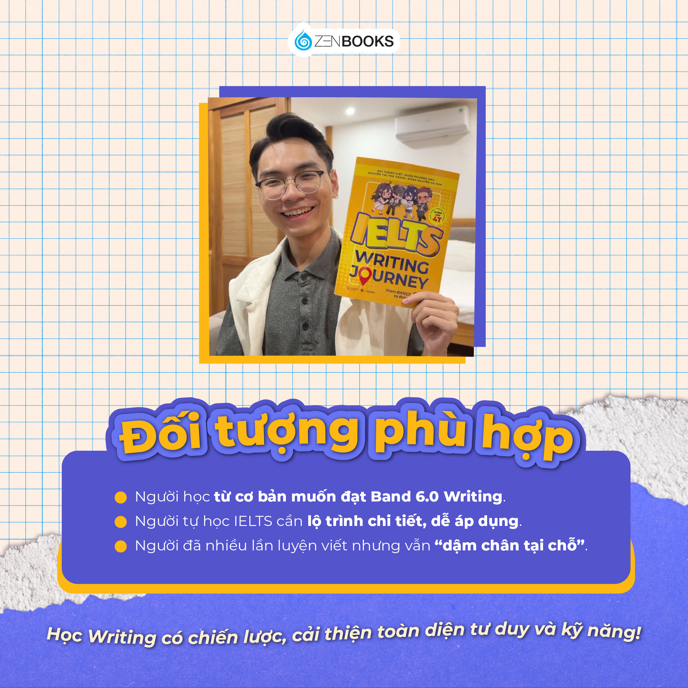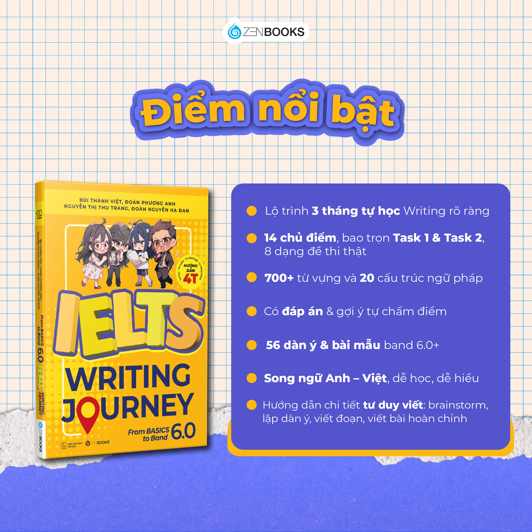 - Cẩm nang hướng dẫn các phương pháp học hiệu quả Tương tự như xây một ngôi nhà, nếu nền móng không vững thì tòa nhà sau khi hoàn thành cũng sẽ rất dễ đổ sụp. Đó là lý do mà nền móng luôn là giai đoạn được ưu tiên và cũng là phần tốn nhiều thời gian nhất. Học IELTS cũng giống như vậy. Nếu từ ban đầu người học không đầu tư cho nền móng, hay nói chính xác hơn là không có phương pháp học đúng chuẩn và hiệu quả, thì giai đoạn về sau sẽ cực kỳ chông gai và khiến bạn dễ dàng bỏ cuộc. • Hướng dẫn toàn diện 4 kỹ năng IELTS: Listening - Reading - Writing - Speaking, thông qua phương pháp thực tế, dễ áp dụng. • Tư duy học đúng từ đầu: Giúp bạn phản xạ tiếng Anh tự nhiên, không cần dịch trong đầu. • Khắc phục lỗi học sai lầm thường gặp: Vì sao band mãi không tăng, vì sao dùng từ vựng “ngầu” mà vẫn sai? • Kỹ thuật độc quyền: “Tư duy ngược” trong IELTS Reading, “PEEL” cho Writing Task 2, “Chunking” để xử lý số liệu nhanh. • Chương Bonus đặc biệt: Hướng dẫn cách tập trung hiệu quả - một kỹ năng then chốt thường bị bỏ qua. Nhà Phát Hành : Zenbooks Tác giả : Trương Kỳ Tông - Võ Thái Thảo Nhi Năm Xuất Bản : 2025 Nhà Xuất Bản : NXB Thế Giới Số Trang : 204 Bìa Mềm Sách IELTS Speaking Journey và IELTS Writing JourneyTừ Cơ Bản Đến Band 6.0 IELTS Speaking Journey – Speak Your Way to Band 6.0 Nhà phát hành : Zenbooks NXB : Thế Giới Tác giả : Nguyễn Cảnh Luân Số trang : 256 Loại bìa : Bìa mềm Xuất bản năm : 04/2025 Chinh phục band 6.0 IELTS Speaking với phương pháp IDEO và lộ trình tự học toàn diện Lộ trình tự học IELTS Speaking chinh phục band 6.0 nhanh chóng. Phương pháp IDEO mở rộng câu trả lời cho mọi câu hỏi, giúp tăng khả năng phản xạ. Luyện nghe nói với bộ video hướng dẫn từng bài của tác giả. Bạn đã bao giờ rơi vào tình huống “bí ý” khi nói tiếng Anh? Bạn đã từng ôn luyện hàng tháng trời nhưng điểm Speaking mãi không vượt nổi band 6.0? Đã đến lúc bạn cần một cuốn sách – không chỉ dạy bạn trả lời mà còn giúp bạn suy nghĩ, phản xạ và nói tiếng Anh một cách tự nhiên. IELTS Speaking Journey – Speak Your Way to Band 6.0 là cuốn sách dành riêng cho bạn – người đang muốn bứt phá kỹ năng Speaking một cách bài bản, nhanh chóng và đúng hướng. ĐIỂM NỔI BẬT CỦA SÁCH: - Phương pháp IDEO (Idea – Detail – Example – Opinion): Giúp bạn mở rộng ý tưởng cho bất kỳ câu hỏi nào trong IELTS Speaking, tránh “học vẹt” và phản xạ tốt hơn khi vào phòng thi. - Lộ trình học thông minh: Chia thành 4 chương tương ứng với 4 tiêu chí chấm điểm (Fluency, Vocabulary, Grammar, Pronunciation), giúp bạn cải thiện trọn vẹn từng kỹ năng. - Thiết kế hiện đại – Trình bày dễ học: Sách in màu, dàn trang bắt mắt, bài học ngắn gọn – dễ nhớ, kèm bài tập luyện tập ngay sau mỗi phần lý thuyết. - Hướng dẫn bằng tiếng Việt – Thân thiện với người tự học: Ngôn ngữ gần gũi, có chú thích rõ ràng như một gia sư riêng luôn kề bên chỉ dẫn. QUÀ TẶNG KÈM: - Bộ video luyện nghe-nói từng bài do chính tác giả hướng dẫn – hỗ trợ bạn luyện nghe, nói ngay tại nhà! - Bảng tiêu chí chấm điểm Việt hóa chuẩn thi thật AI NÊN SỞ HỮU CUỐN SÁCH NÀY? - Người học IELTS tự luyện tại nhà muốn đạt band 6.0 Speaking - Người đã thi IELTS nhiều lần nhưng chưa vượt ngưỡng band 6.0 - Học sinh, sinh viên hoặc người đi làm muốn nâng cao khả năng diễn đạt tiếng Anh trôi chảy, tự nhiên IELTS WRITING JOURNEY FROM BASICS TO BAND 6.0 Tái Bán 2024 Nhà phát hành: Zenbooks Tác giả: Bùi Thành Việt, Đoàn Phương Anh, Nguyễn Thị Thu Trang, Đoàn Nguyễn Hạ Đan Nhà xuất bản: Thế Giới Năm phát hành: 2024 Kích thước: 25cm x 19cm Số trang: 280 Lộ trình 3 tháng tự học IELTS Writing, cuốn sách được chuyên gia tin tưởng giới thiệu Có điều kiện thì mới học được IELTS? Ngoài đổ bạc triệu vào trung tâm, có cách nào để việc học IELTS Writing ít tốn kém mà vẫn hiệu quả? Có lộ trình nào đáng tin để người học nâng band IELTS Writing tại nhà? Bên cạnh đó, cuốn sách còn chứa đựng kinh nghiệm của 3 đồng tác giả khác là Đoàn Phương Anh, Nguyễn Thị Thu Trang, Đoàn Nguyễn Hạ Đan - đều là những giáo viên gen Z với trình độ 8.0+ IELTS. Từng viết rất nhiều, cũng có những lần thất bại bầm dập, thử nghiệm qua nhiều phương pháp học; nhóm tác giả thấu hiểu những nỗi nhọc nhằn, loay hoay, lẫn các bí kíp then chốt để giúp chính mình và sau này là giúp các bạn có thể có phương hướng rõ ràng, nhanh chóng nâng điểm IELTS Writing.