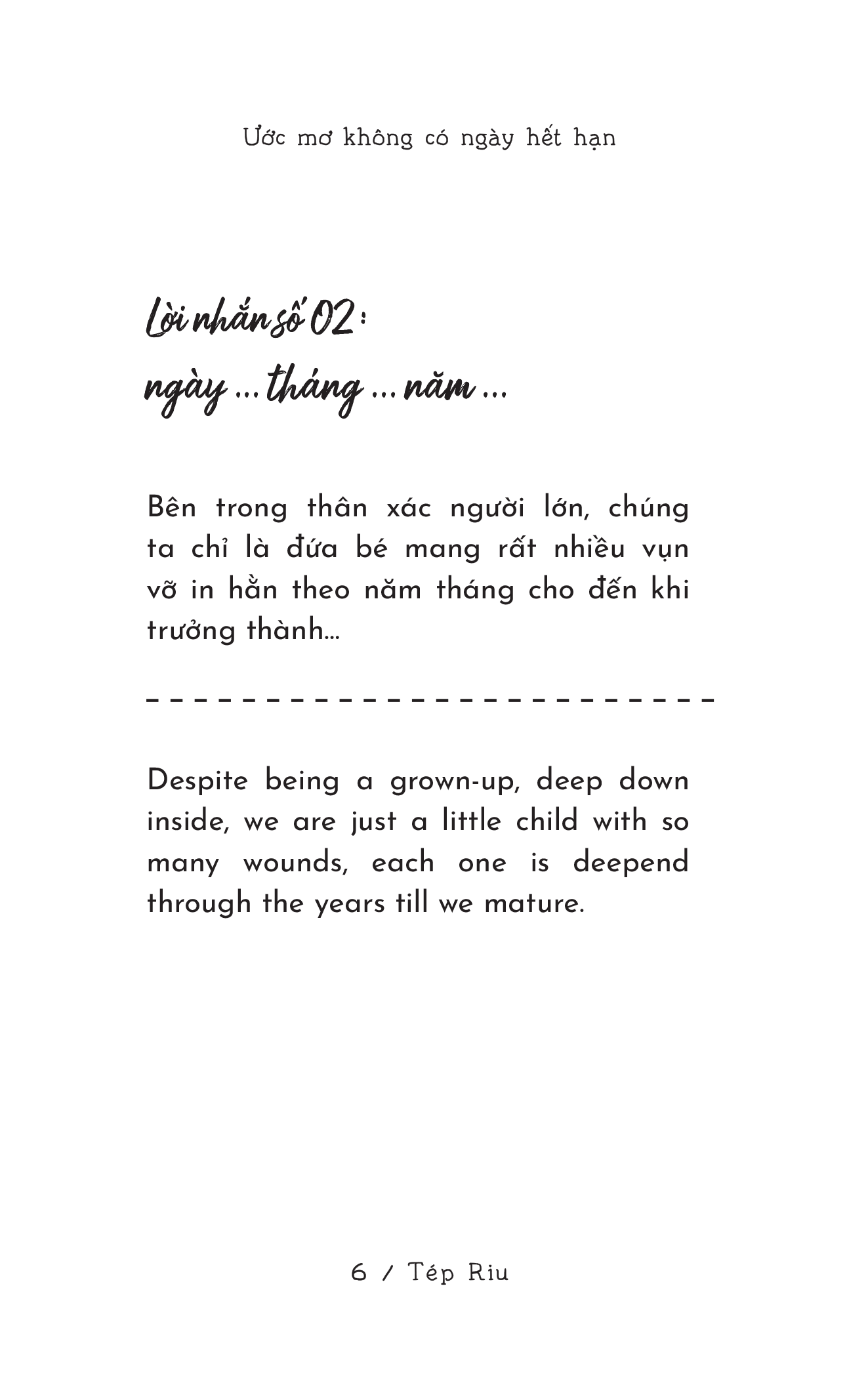 THÔNG TIN TÁC PHẨM Tên tác phẩm: Just For Youth - Ước Mơ Không Có Ngày Hết Hạn Tác giả: Tép Riu Dịch giả: Quacakydieu Thể loại: Tản văn song ngữ Thương hiệu: Timebooks Nhà xuất bản: NXB Dân Trí Ngôn ngữ: Tiếng Việt – Tiếng Anh Mã ISBN: 978-604-40-7915-8 Loại bìa: Bìa mềm Khổ: 11.5x17 cm Số trang: 200 trang Công ty phát hành: CÔNG TY CỔ PHẦN TIME BOOKS