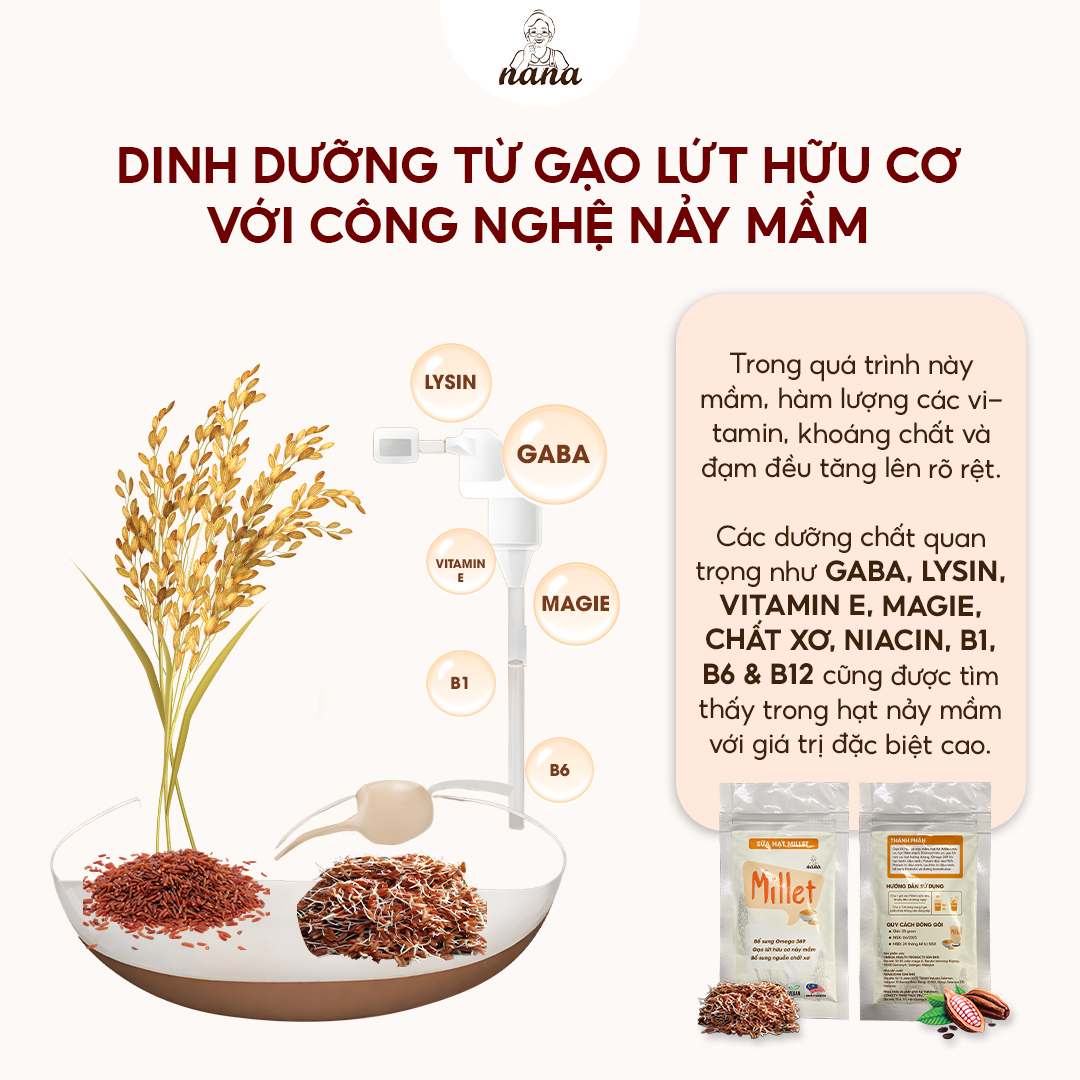 - Thành phần sữa hạt Millet: Gạo lứt hữu cơ nảy mầm - Hạt Kê (Millet) hữu cơ - Hạt Diêm mạch (Quinoa) hữu cơ - Gạo lứt hữu cơ - Hạt hướng dương - Omega 369 từ hạt lanh - Protein đậu vàng PEA, Protein, Lecithin đậu nành, Prebiotic và Isomaltulose. SP của OMEGA HEALTH PRODUCTS SDN BHD NSX: NOVASONN SDN BHD MALAYSIA NK&PP tại VN: CÔNG TY TNHH THỰC PHẨM NP DINH DƯỠNG TỪ GẠO LỨT HỮU CƠ VỚI CÔNG NGHỆ NẢY MẦM Hạt nảy mầm thương mại được chế biến trong môi trường vô trùng và thường được sấy khô hoặc khử nước trước khi đóng gói để ngăn ngừa nấm mốc cũng như nguy cơ bệnh tật do thực phẩm, vì khó tạo ra một môi trường vô trùng tại nhà. 24Grains giàu dinh dưỡng & các loại vitamin khoáng chất từ hạt gạo lứt hữu cơ nảy mầm. Trong quá trình nảy mầm, hàm lượng các vitamin, khoáng chất & đạm đều tăng lên rõ rệt. Các dưỡng chất quan trọng như GABA, lysin, Vitamin E, magie, chất xơ, niacin, B1, B6 & B12 cũng được tìm thấy trong hạt nảy mầm với giá trị đặc biệt cao. NGUYÊN TẮC 4 KHÔNG: