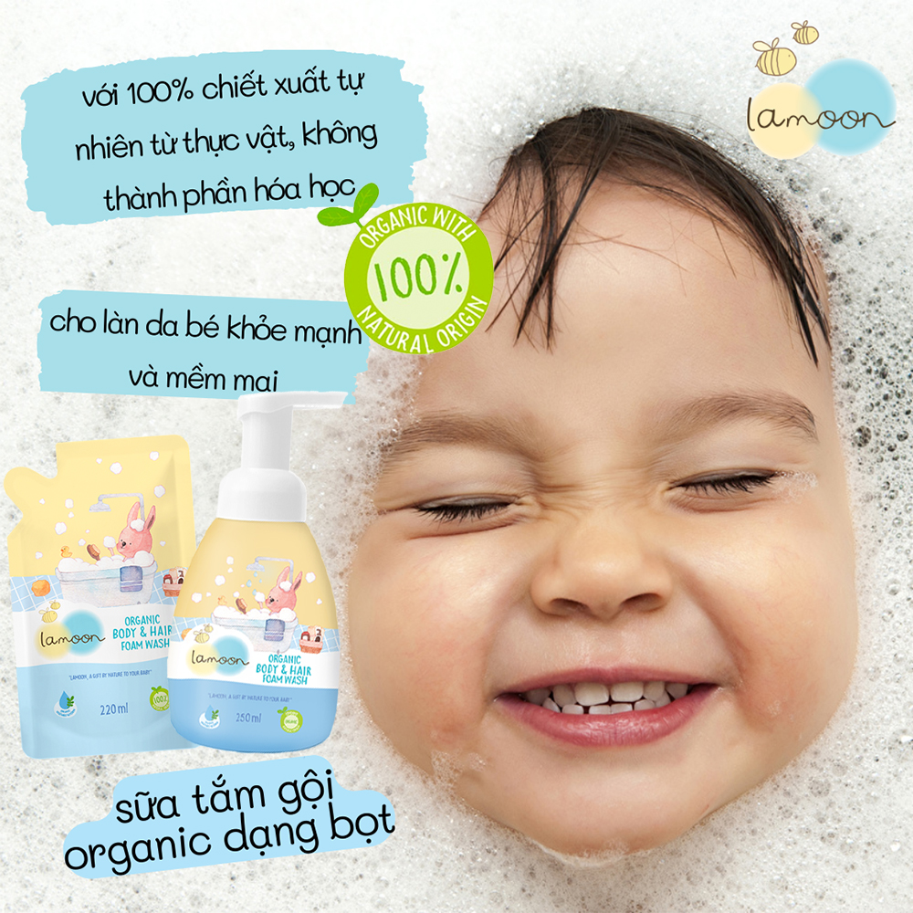 Bé yêu của bạn vốn có làn da non nớt và hệ miễn dịch còn chưa hoàn thiện, vô cùng nhạy cảm, rất dễ bị dị ứng với các chất hóa học có trong những sản phẩm tắm gội hóa tổng hợp dành cho bé trên thị trường. Với sữa tắm gội hữu cơ (organic) cho bé dạng bọt của Lamoon hoàn hảo cho da bé, ba mẹ không cần phải lo lắng khi sử dụng. Sản phẩm với 100% chiết xuất tự nhiên từ thực vật, không chỉ có tác dụng làm sạch da và tóc mà còn có công dụng dưỡng và tăng sức đề kháng cho da nhờ vào các vitamin, dưỡng chất từ tự nhiên, đảm bảo cho bé làn da và mái tóc khỏe mạnh và mềm mại.