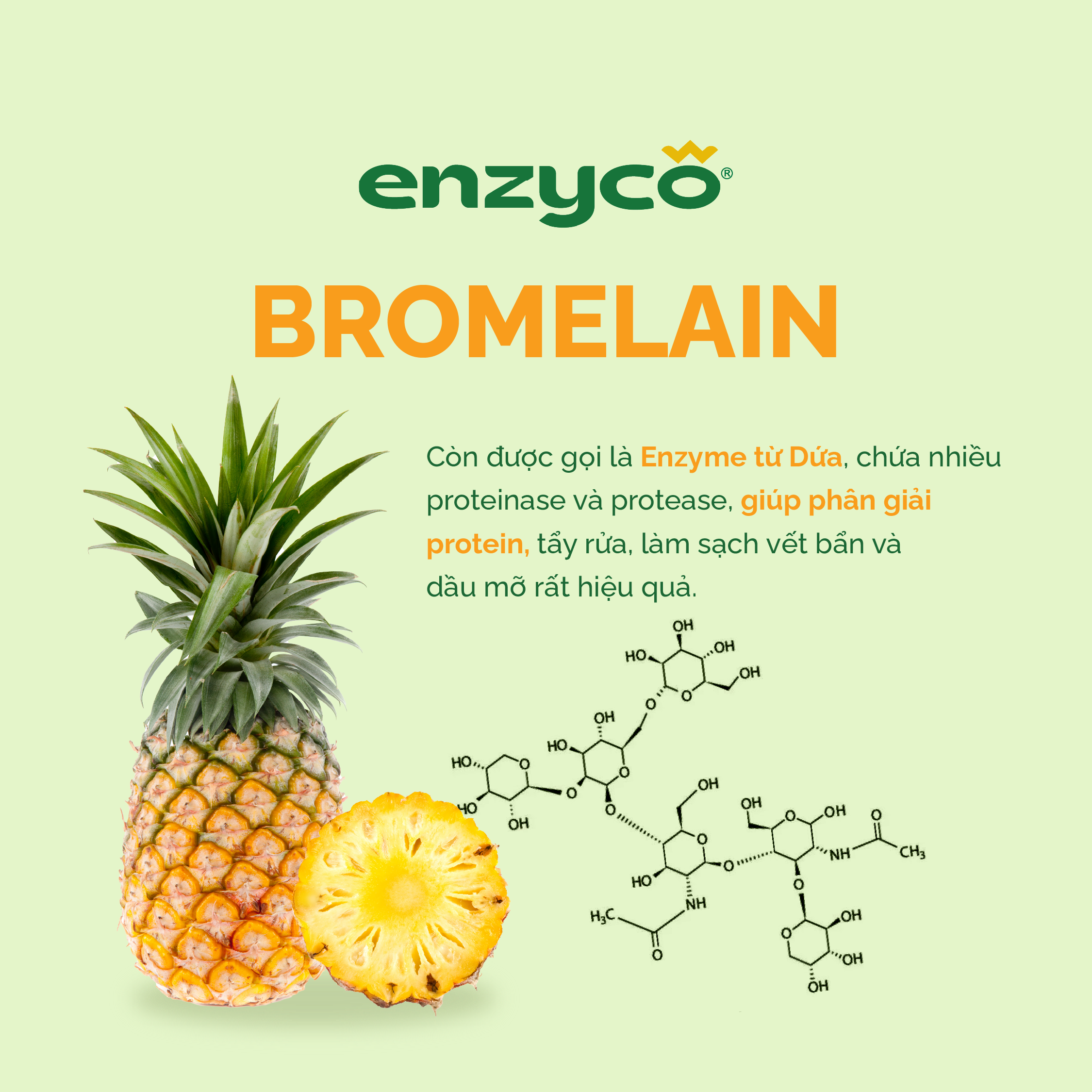 • Dứa ủ lên men theo phương pháp độc đáo của Enzyco sẽ tạo ra Enzyme Bromelain và dung dịch có tính axit hữu cơ khá mạnh giúp tẩy rửa, làm sạch vết bẩn và dầu mỡ rất hiệu quả. (Chúng tôi chỉ sử dụng vỏ dứa để tạo enzyme, giúp hạn chế rác thải nông nghiệp