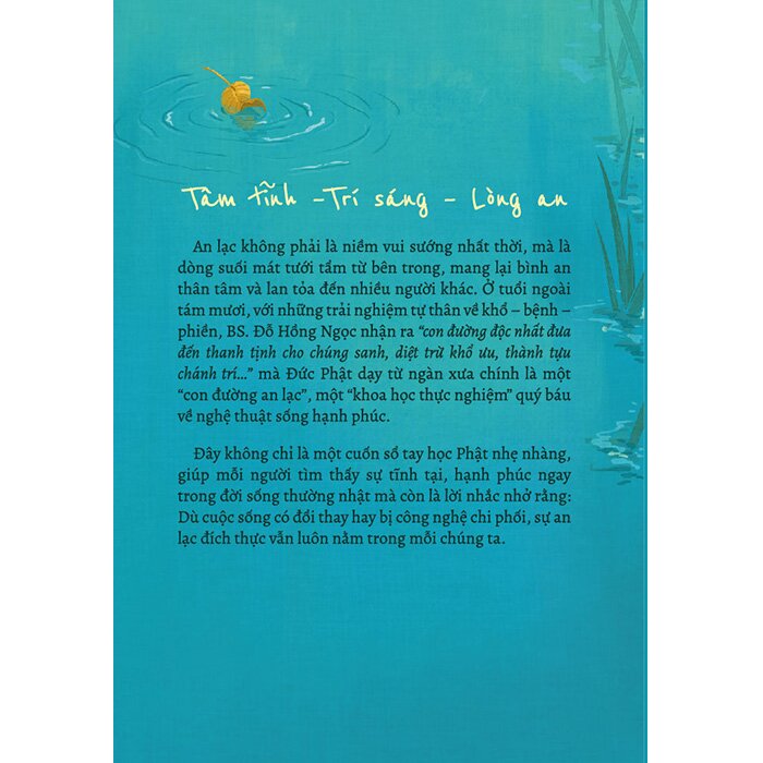 An lạc không phải là niềm vui sướng nhất thời, mà là dòng suối mát tưới tẩm từ bên trong, mang lại bình an thân tâm và lan tỏa đến nhiều người khác. Ở tuổi ngoài tám mươi, với những trải nghiệm tự thân về khổ - bệnh - phiền, BS. Đỗ Hồng Ngọc nhận ra “con đường độc nhất đưa đến thanh tịnh cho chúng sanh, diệt trừ khổ ưu, thành tựu chánh trí…” mà Đức Phật dạy từ ngàn xưa chính là một “con đường an lạc”, một “khoa học thực nghiệm” quý báu về nghệ thuật sống hạnh phúc.