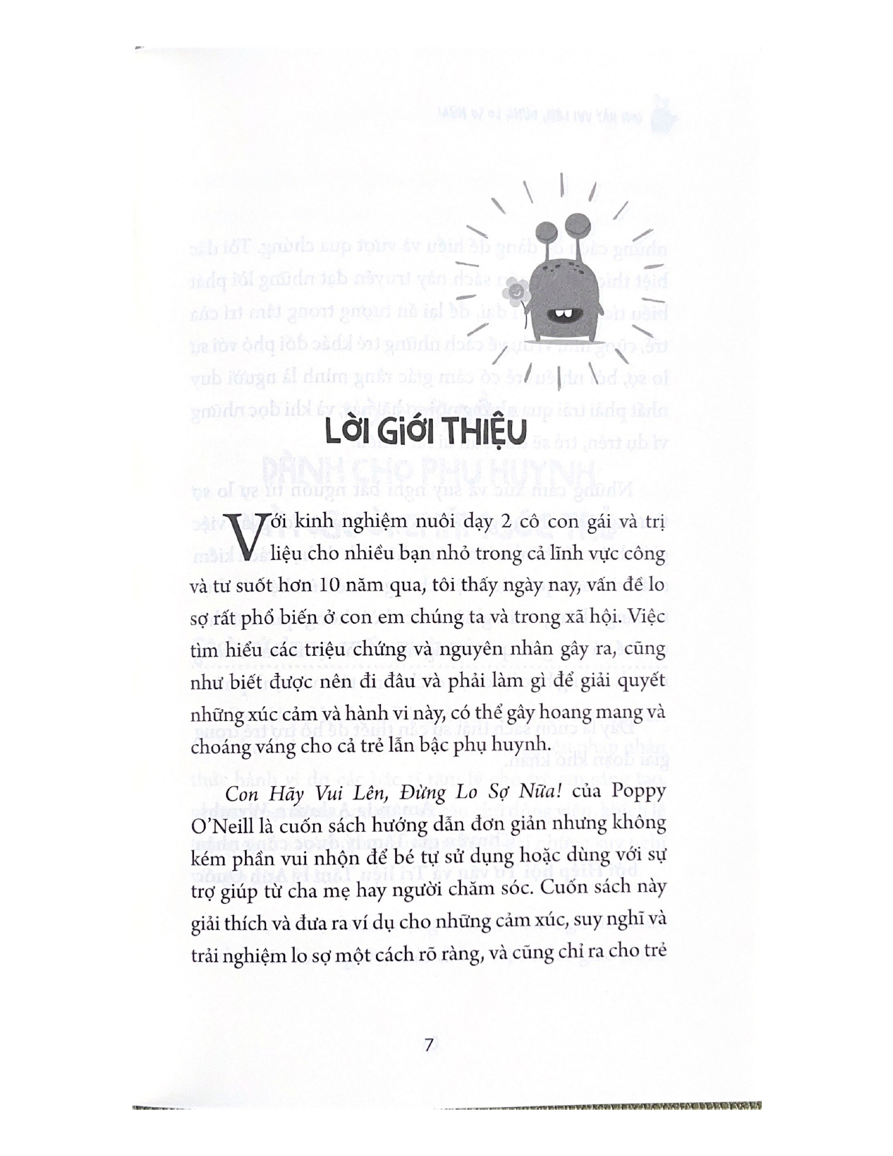 Những hướng dẫn trong CON HÃY VUI LÊN, ĐỪNG LO SỢ NỮA! được tổng hợp từ những phương cách giám định hành vi được chính những chuyên gia tâm lý trẻ em sử dụng. Cuốn sách chứa đựng những hoạt động thực hành đơn giản có thể giúp trẻ từ 7 đến 11 tuổi vượt qua trạng thái lo sợ, bởi vì đây là độ tuổi mà trẻ sẽ trải qua nhiều thay đổi trong tâm lý và ảnh hưởng đến sự phát triển sau này.