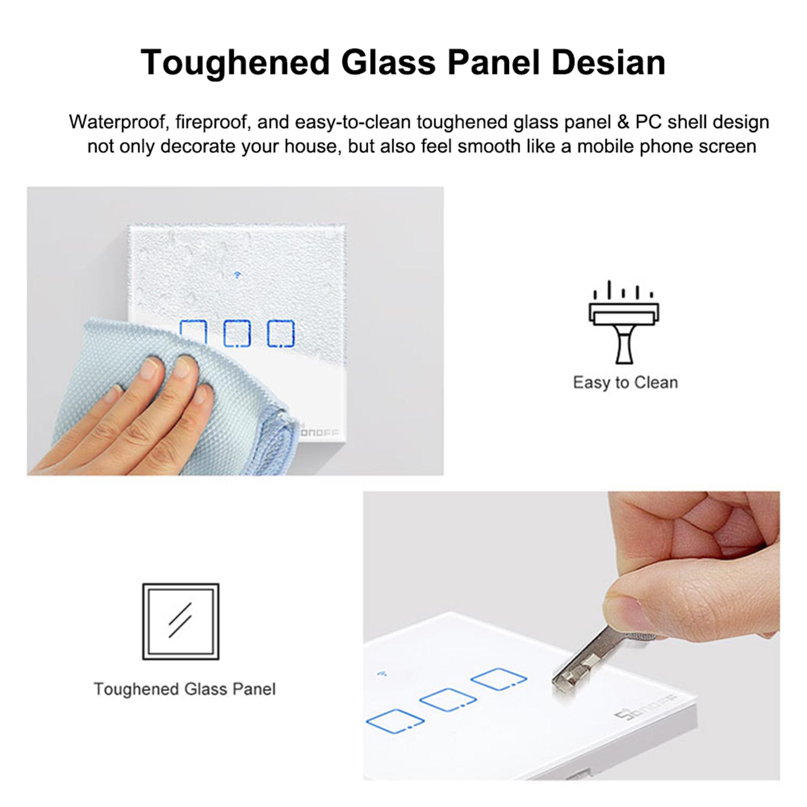 Overview: The WiFi smart switch can be controlled remotely using your phone, and devices connected with switches can work independently. Sonoff T1 supports 433MHz remote controller (not included) to control. Works with Amazon Alexa and Google Assistant which let you turn on or off your appliances with a voice command, perfect for those need to handle much housework simultaneously. Features sensitive touch buttons that are attached on the simple and stylish switches to ensure a modern and nice decoration on any wall surface. A slight tap for easier control. Set a time for devices and the switches will help you turn on or off them automatically. Tailor smart scene for your appliances. simply set an event to happen to trigger one SONOFF device or groups of devices with a tap on your phone. Compatible with IFTTT function, the switch can communicate with a slew of devices and services, to trigger them on or off. Features: Remotely control devices through a phone. Turn on/off devices with Amazon Alexa and Google Assistant. Touch control buttons for convenient operation. Set a particular time to turn on/off devices. Customize one or groups of SONOFF devices to turn on/off with a simple tap. Allow you to manage devices when there is no WiFi network in your space. Control the device with your family together via device sharing. Sync the real-time device status to your phone. IFTTT service triggers a bunch of actions. Can be managed by the 433MHz remote controller (not included). Specifications: Brand Name: SONOFF Model: T1 Standard: EU Gang: 1 gang/2 gang/3 gang (Optional) Color: White Input: AC 100-240V 50/60Hz 2A Max Output: AC 100-240V 50/60Hz, 2A/Gang, 6A/Total Max Enclosure Material: Toughened Glass Panel + PC Wireless Standard: IEEE 802.11 b/g/n 2.4G Size: 868635(mm) Package List: 1 * Smart Switch