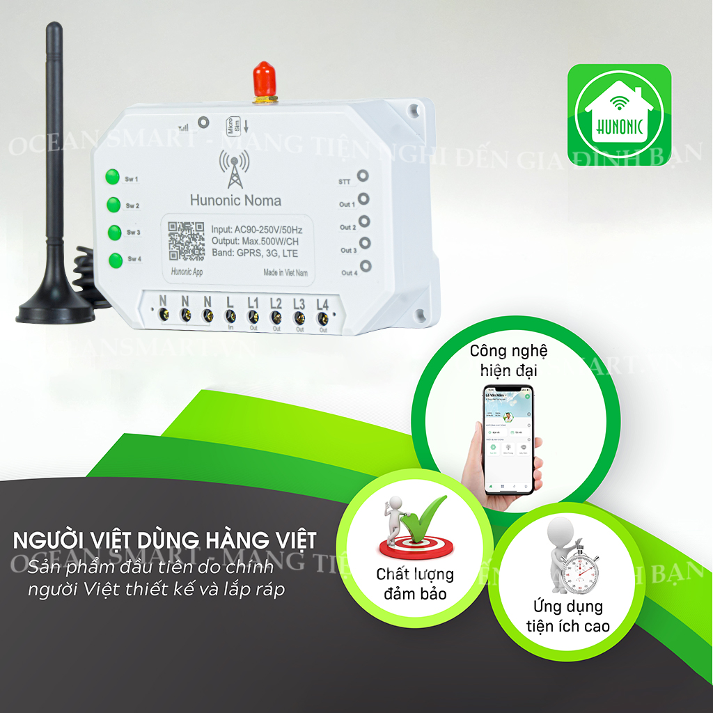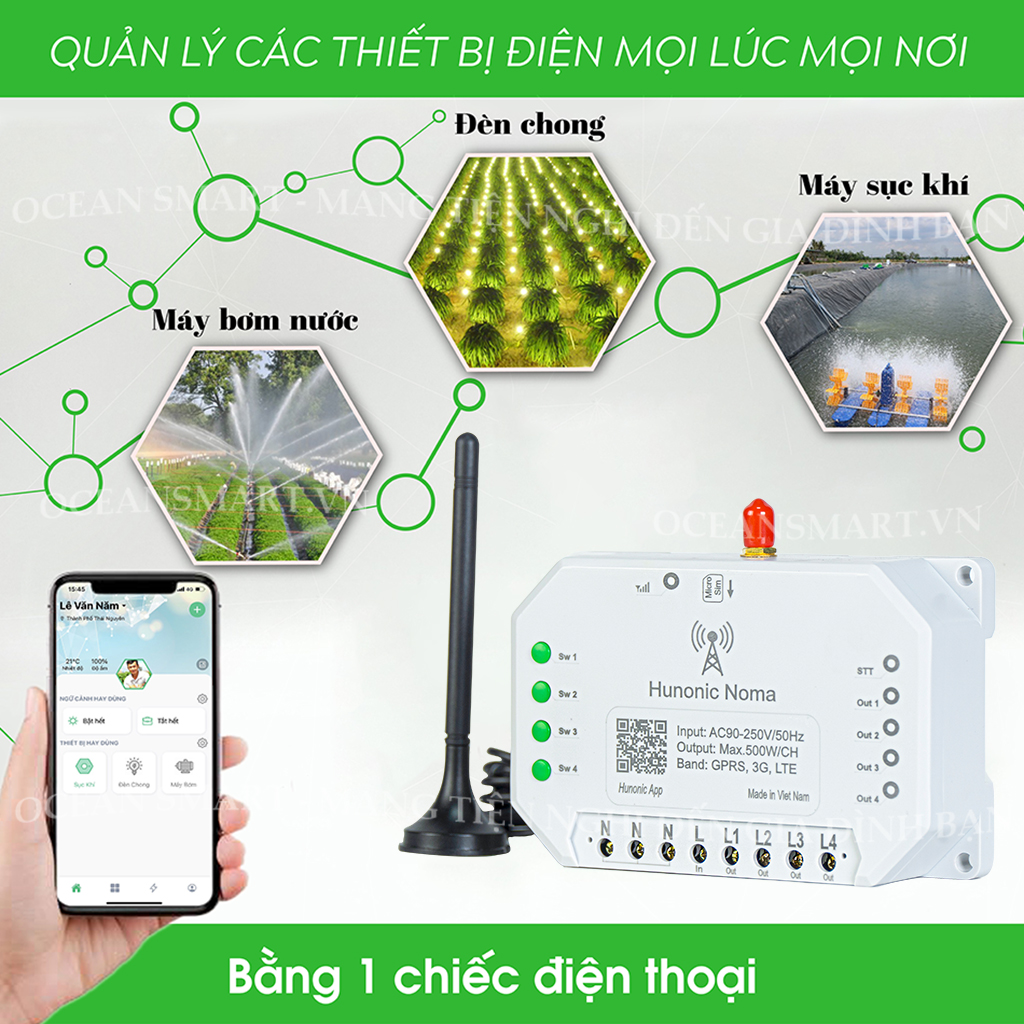 Công Tắc Thông Minh Hunonic Noma Dùng Sim - HNNOMA4CH Sẽ xử lý ra sao nếu các bác có một diện tích lên đến vài hecta thanh long cần chong đèn: Bật muộn, tắt sớm hoặc các bác có cả một vườn chè cần tưới nước hay một ao tôm, cá cần sục khí đúng giờ? Các bác sẽ làm thế nào để chăm sóc diện tích trồng trọt lớn này một cách tiện lợi, tiết kiệm chi phí, thời gian, công sức mà sản lượng vẫn đạt năng suất cao. Kể cả là vùng canh tác có cách xa nhà cả chục cây số? TRANG BỊ NHIỀU TÍNH NĂNG VƯỢT TRỘI. HUNONIC NOMA 4CH KHÔNG CHỈ GIẢI QUYẾT TỐT CÁC VẤN ĐỀ TRÊN MÀ CÒN LÀM TỐT NHIỀU HƠN THẾ NỮA. Hôm nay, chúng tôi đặc biệt giới thiệu đến các bác một loại công tắc thông minh mới nhất, có thể lắp ở bất cứ nơi đâu mà “không cần Wifi” như các thiết bị điều khiển từ xa khác. Đó chính là công tắc Hunonic Noma. Loại công tắc duy nhất trên thị trường điều khiển các thiết bị như hệ thống tưới tiêu, máy bơm, đèn chong thanh long, máy sục khí, máy bắn cám cá,… qua sóng điện thoại.  Sản phẩm do các kỹ sư Việt Nam nghiên cứu và sản xuất. Chất lượng tốt, phù hợp với điều kiện thời thiết ở Việt Nam nên độ bền cao, hoạt động ổn định, giá cả hợp lý. Đặc biệt là điều khiển thiết bị qua HUNONIC APP mà không cần nhắn tin hay gọi điện rắc rối như các thiết bị cùng loại hiện có trên thị trường.   LỢI ÍCH KHI SỬ DỤNG CÔNG TẮC HUNONIC NOMA Các bác có thể điều khiển bật, tắt thiết bị ở bất cứ nơi đâu, bất cứ thời gian nào mà không cần đến tận nơi. Vô cùng tiện lợi.  Hẹn giờ tự động giúp thời gian chong thanh long từ 22h – 4h sáng đạt hiệu quả tốt. Tưới tiêu bật đúng giờ, tắt đúng lịch hẹn,… Các bác khỏi cần vất vả thức khuya, dậy sớm. Hunonic Noma có khả năng phản hồi trạng thái nhanh. Qua điện thoại thông minh các bác sẽ nhìn thấy thiết bị đang đang bật hay đang tắt.  Chia sẻ thiết bị cho nhiều người điều khiển trên điện thoại cá nhân riêng biệt cực kỳ nhanh chóng. Theo kết quả thực nghiệm thì mỗi ngày bật/tắt 100 lần, 1 tháng tiêu tốn chưa đến 2 ngàn đồng. Cực kỳ tiết kiệm. Sản phẩm được sản xuất tại Việt Nam nên độ tin cậy cao, đường truyền ổn định. Bảo mật tuyệt đối. Bảo hành đổi mới 1 đổi 1 trong suốt 12 tháng. … Và còn rất nhiều ứng dụng mang lại lợi ích tuyệt vời khác nữa đang chờ các bác trải nghiệm. ***Thông số sản phẩm: – Mã sản phẩm: HNNOMA4CH – Điện áp: AC90 – 250V/ 50Hz – 4 ngõ ra, tải 500w mỗi ngõ –Giao tiếp: GPRS, 3G, LTE – Bảo hành: 12 tháng – Kích thước: 120x113x40mm – Khối lượng: 200gr
