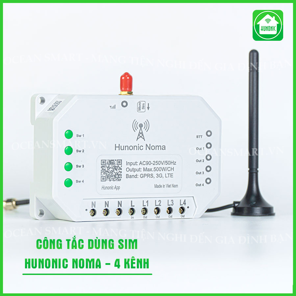 ✨Công Tắc Thông Minh Hunonic Noma Dùng Sim, Điều Khiển Mọi Thiết Bị Từ Xa Qua Điện Thoại - HNNOMA4CH