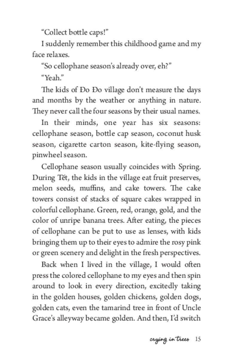 This time I will tell her that I love her very much, such a big love, and the reason why the last time I didn’t dare express my love in a natural way is because I thought I was about to die. I will tell her the story of how the doctors misdiagnosed me, and that is why I didn’t return to the village. In this spot, I will lie to Turtle a bit. I am not yet ready to mention the real reason that kept me in Sài Gòn for three whole years. The story of her origin, I will tell her later so she knows.