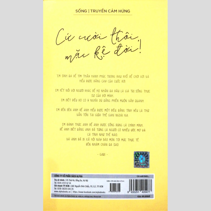 Có thể mọi cuộc tình đều có kết thúc có hậu cũng có thể dở dang, và khi tình yêu dở dang thì người ở lại bao giờ cũng là người buồn lâu hơn cả. Chúng ta rồi ai cũng phải vượt qua nỗi buồn đó để trưởng thành hơn, yêu bản thân nhiều hơn. Tác giả Gari qua Cứ cười thôi, mặc kệ đời ! dường như đang muốn nhắn nhủ những ai đã thất bại trong tình yêu rằng: Có thể bạn không là ai cả, nhưng không có nghĩa bạn chẳng là gì cả. Hãy cứ cười lên và yêu lấy chính mình, mặc kệ ngoài kia dông bão…