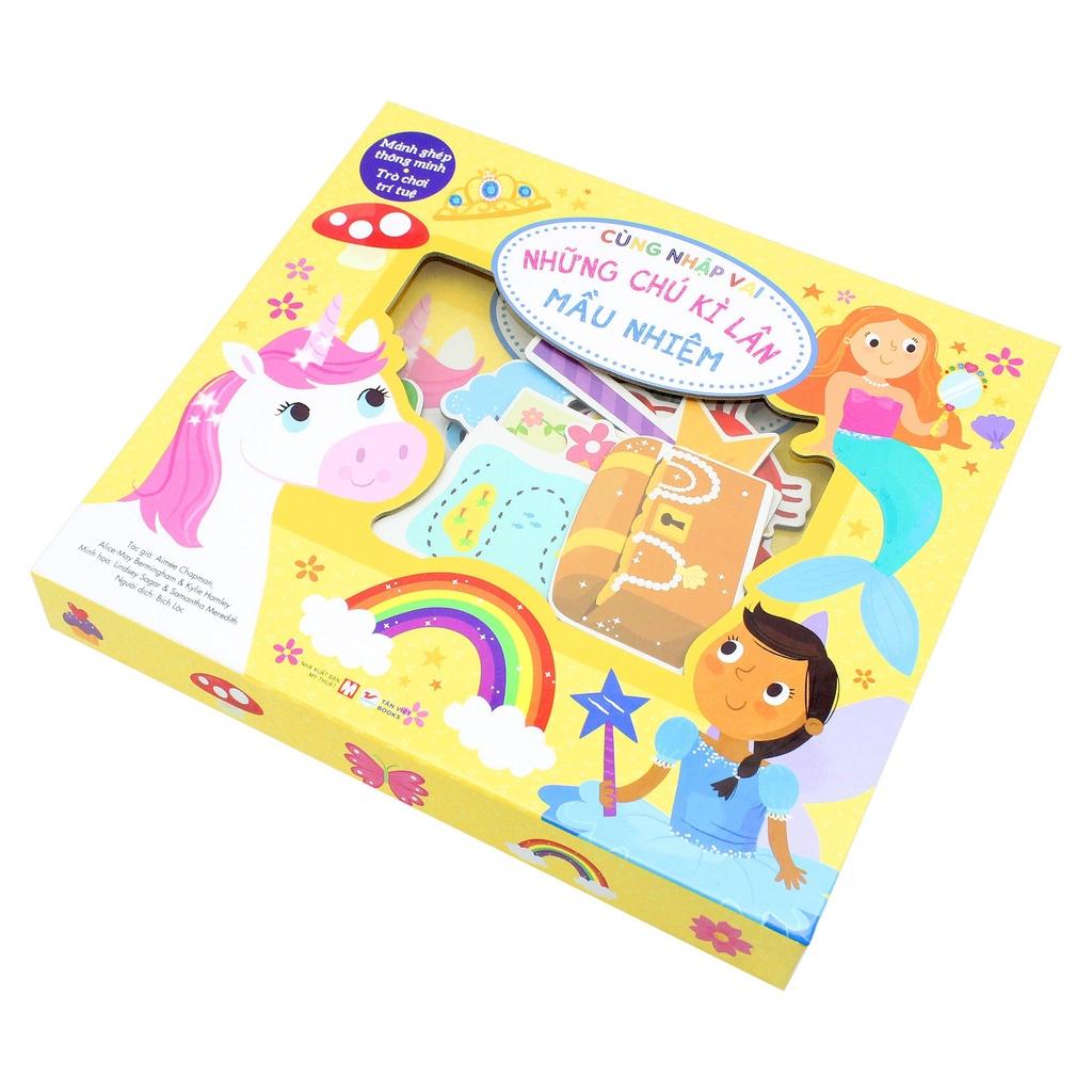 Cùng Nhập Vai - Những Chú Kì Lân Mầu Nhiệm Trẻ nhỏ thường tỏ ra thích thú khi được hóa thân vào các nhân vật và làm nhiều công việc khác nhau. Còn gì thú vị hơn khi với một bộ sách, trẻ được hòa mình nhập vai vào các nhân vật đa dạng? Tiếp nối 2 cuốn Thám Hiểm Thế Giới Khủng Long và Bữa Tiệc Của Công Chúa, Tân Việt Books tiếp tục thực hiện cuốn Những Chú Kì Lân Mầu Nhiệm với diện mạo hộp màu vàng bắt mắt. Cuốn sách sẽ cho các bé cơ hội chứng kiến cuộc đua thể thao kì thú của những chú kì lân, đảm bảo để lại những trải nghiệm ấn tượng và khó quên trong lòng bé. Bé hãy từ từ trải nghiệm nhé! Với những bức tranh sinh động, những đồ vật đáng yêu và 15 mảnh ghép để chơi cùng, cuốn sách Những chú kì lân mầu nhiệm chính là lựa chọn hoàn hảo cho những bạn nhỏ nào muốn khám phá ngôi nhà thân yêu của những chú kì lân mầu nhiệm. Mỗi trò chơi trong bộ sách "Cùng nhập vai" đều