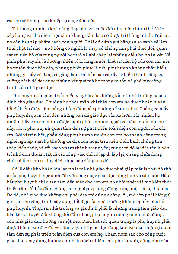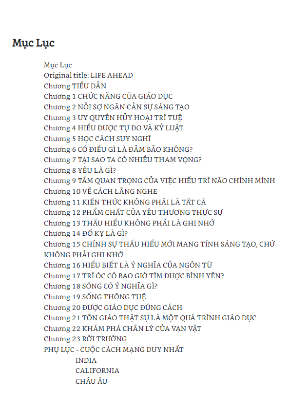 Cũng theo ông, cuộc đời phía trước đòi hỏi con người phải tiến hành một cuộc cách mạng thật sự. Cuộc cách mạng này không bắt đầu với lý thuyết hay ý niệm, lại càng không phải bằng những cải cách trong kinh tế hay chính trị, mà phải bắt nguồn bằng “một cuộc biến đổi triệt để ngay trong tự thân trí não”. Qua những bài phát biểu được ghi chép trong cuốn sách này, bạn đọc sẽ có cơ hội tiếp cận với những lý giải cặn kẽ, rằng tại sao một cuộc biến đổi như thế chỉ-có-thể xảy ra thông qua một nền giáo dục chân chính và sự phát triển toàn diện con người.